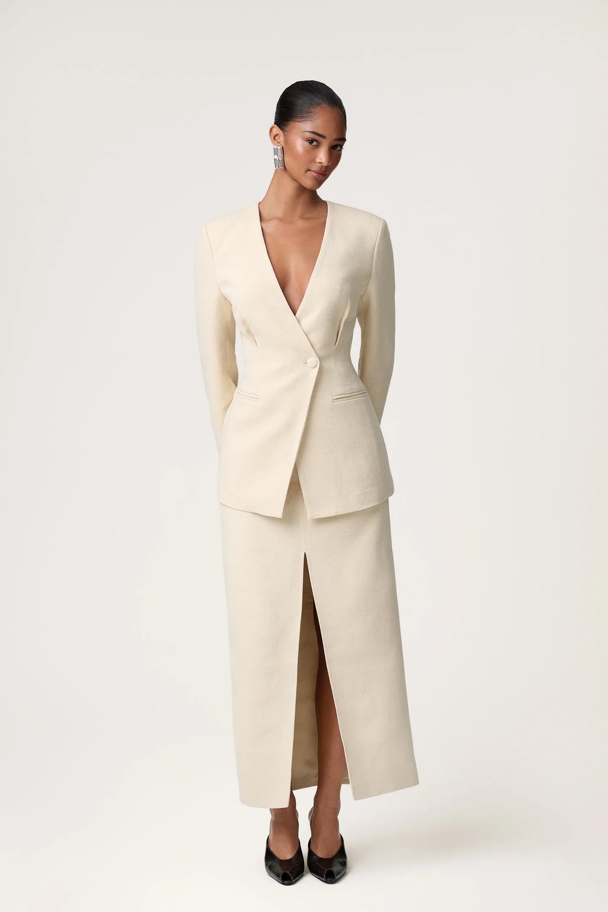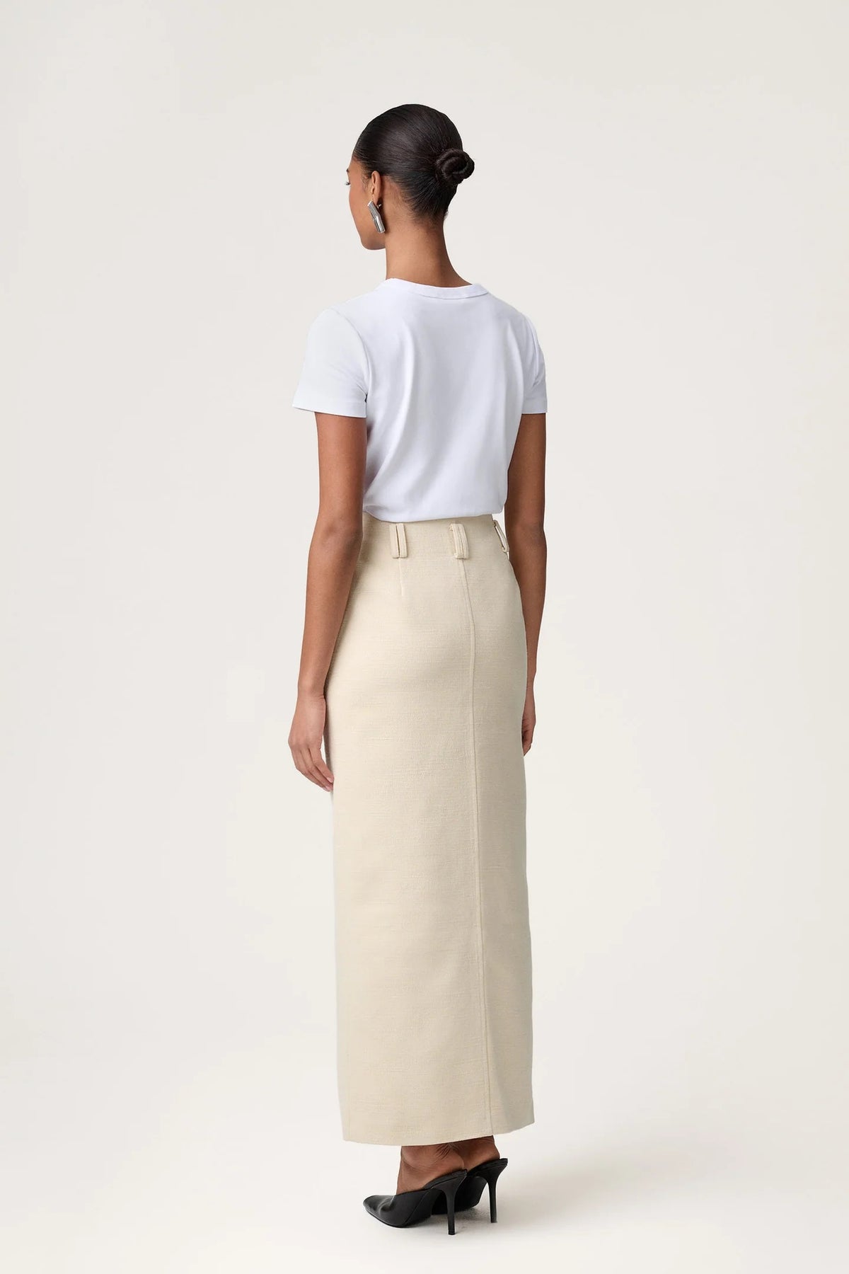 Agra-skjørtet har en rett silhuett designet for å sitte lavt på hoftene med en avslappet, flytende passform. Med en høy splitt foran og løkker i midjen, er det laget i en teksturert strikk for et kult, men sofistikert utseende.