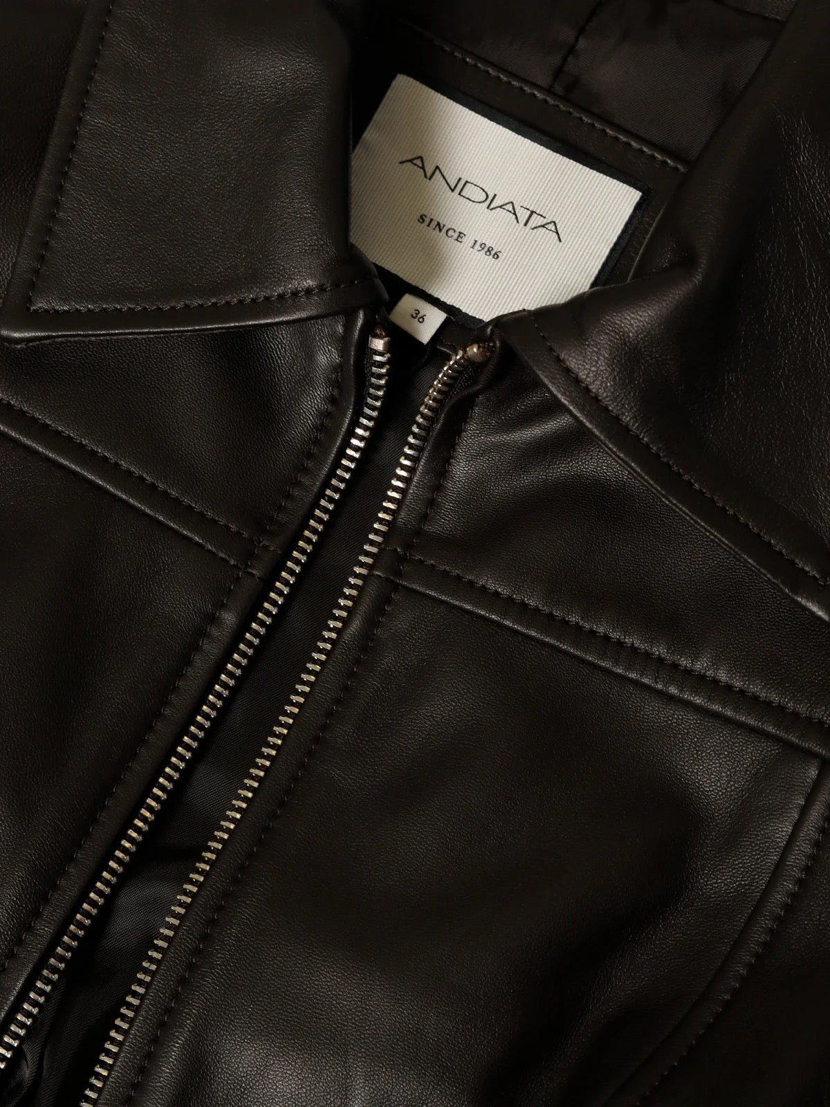 Lett avkortet skinnjakke med rett passform. Lange ermer og krage. Glidelåslukking foran.