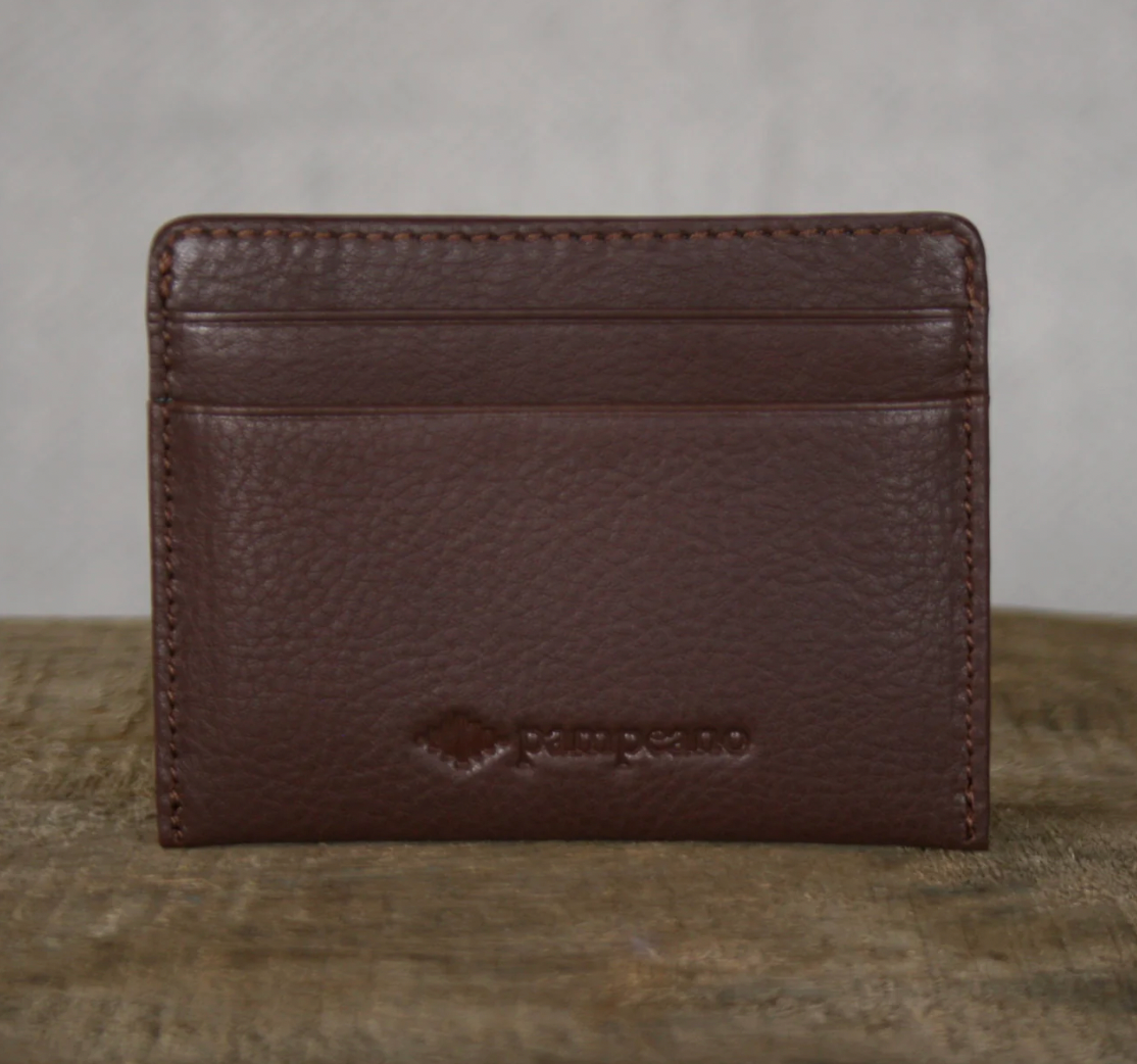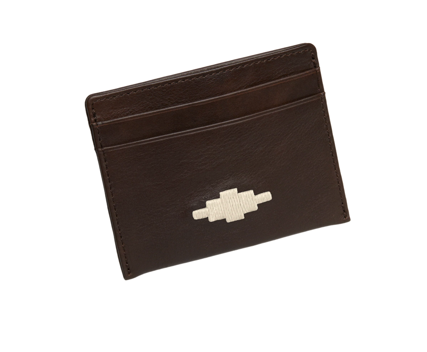 Rombo-kredittkortslippen. Dette kompakte skinntilbehøret har god plass, med fire kredittkortspor og en innvendig midtlomme som trygt kan oppbevare brettede sedler og kvitteringer. Hver lomme er fôret med det mykeste ekte semskede skinnet. Forsiden av kredittkortholderen er håndbrodert med en enkelt pampa-diamant, ved bruk av livlige voksbehandlede salmakertråder.