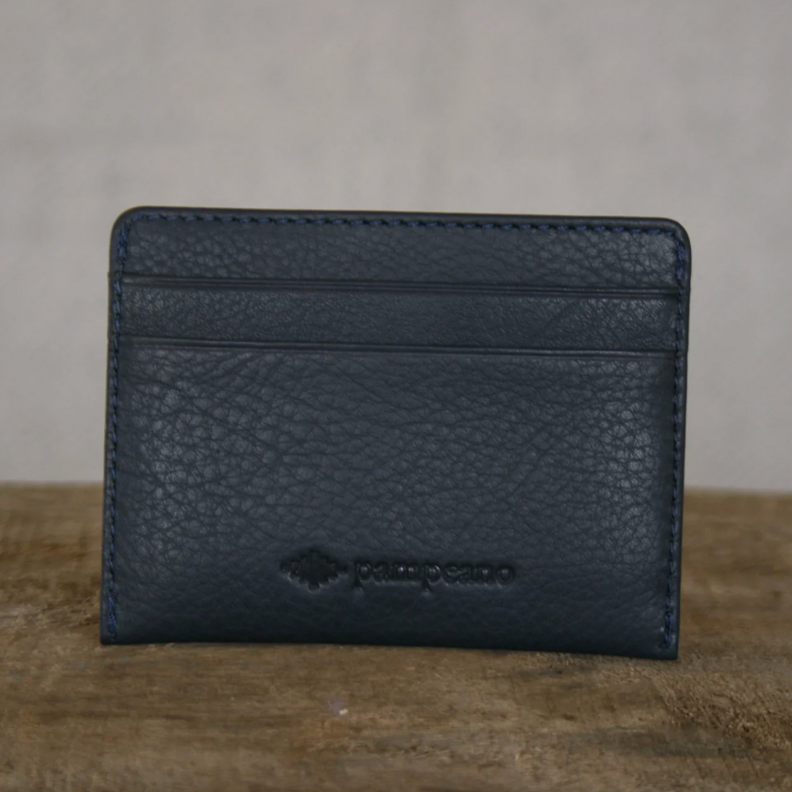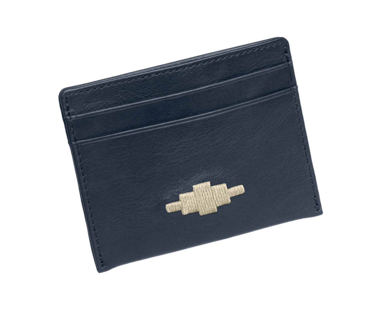 Rombo-kredittkortslippen. Dette kompakte skinntilbehøret har god plass, med fire kredittkortspor og en innvendig midtlomme som trygt kan oppbevare brettede sedler og kvitteringer. Hver lomme er fôret med det mykeste ekte semskede skinnet, i en fantastisk Bandera-blå farge som står i vakker kontrast til den varme skinnfargen. Forsiden av kredittkortholderen er håndbrodert med en enkelt pampa-diamant, ved bruk av livlige voksbehandlede salmakertråder.