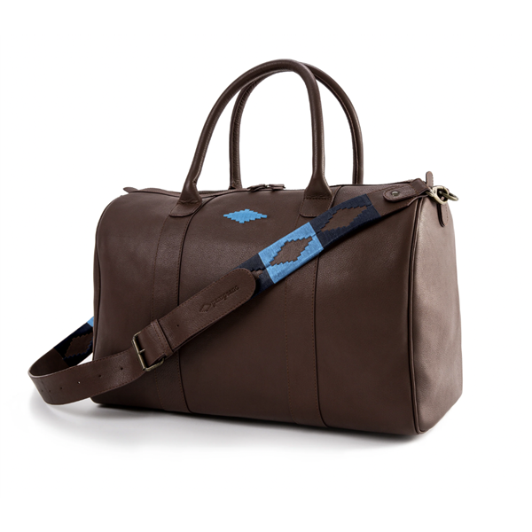 Varon-reiseveske i skinn og lerret. Det Havana-brune skinnet kombinert med det solide marineblå lerretet gir en praktisk og moteriktig veske. Designet fullføres av vår signatur pampa-diamant øverst på vesken.
