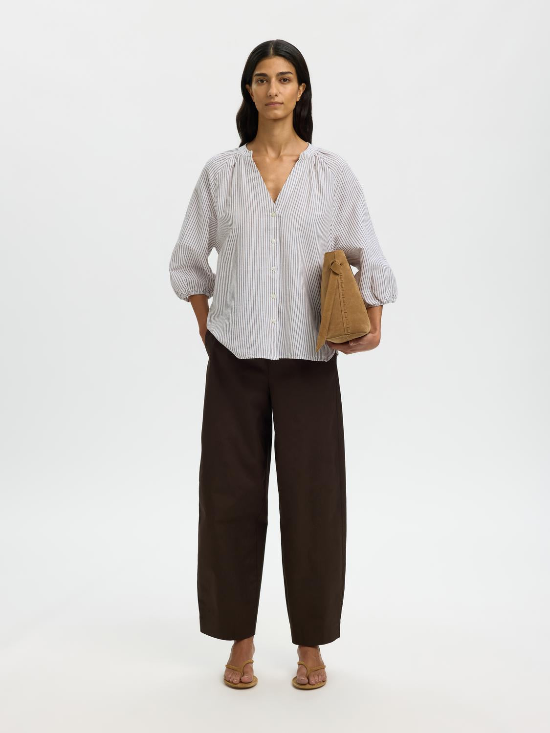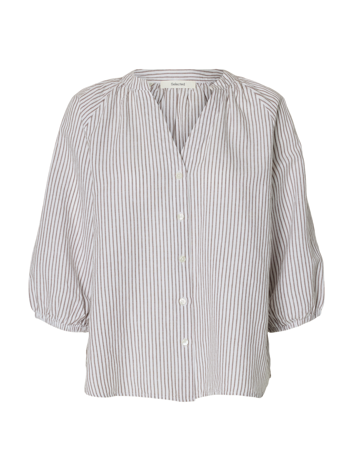 Slwcleo-Alberta Linen Blend Shirt kombinerer stil og komfort med sitt lette og pustende materiale. Denne skjorten har en avslappet passform og er perfekt for varme dager, enten du er hjemme eller ute. 3/4 ermer, kinakrage, elastiske mansjetter og knappelukking