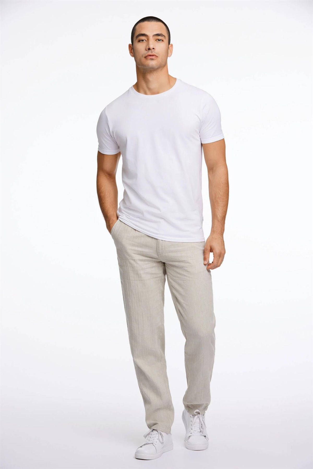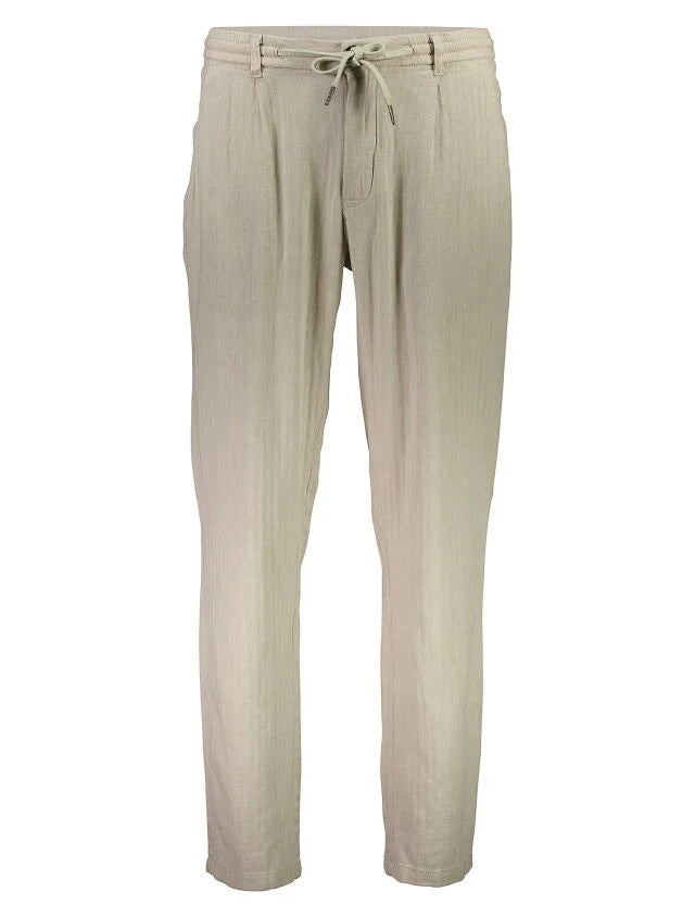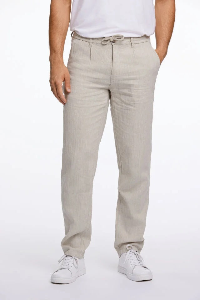 Lindbergh-bukser laget av en lett og komfortabel blanding av bomull og lin med et rent, moderne preg. Designet med sidelommer og paspolerte baklommer for et stilig utseende, og avsluttet med en knapp og skjult glidelås. Den justerbare snøringen i midjen gir et avslappet preg, mens passformen er normal i setet og blir strammere rundt lår, knær og ankler.