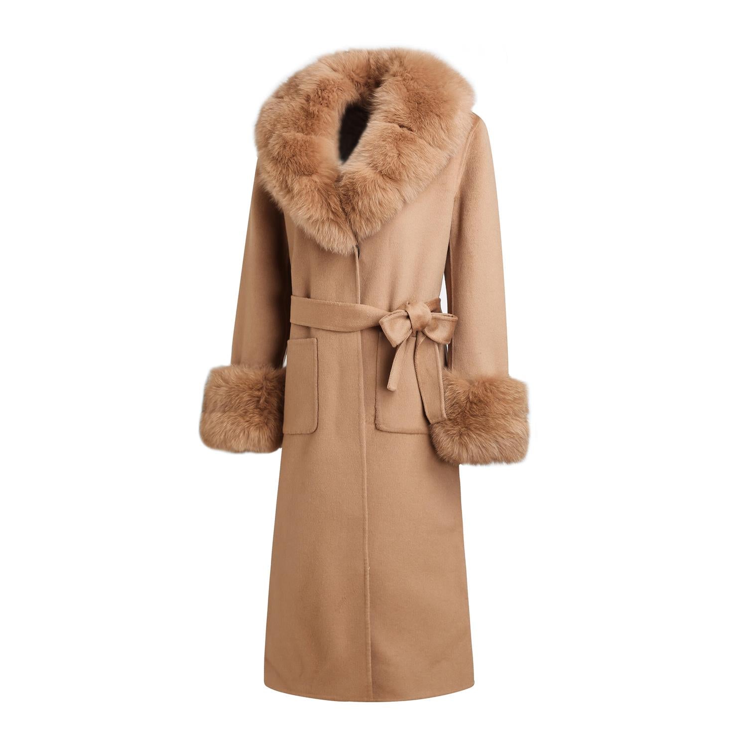 En tidløs kåpe som kombinerer klassisk design med feminine detaljer. Den har en luksuriøs pelskrage som gir et eksklusivt preg, belte i midjen som fremhever silhuetten, og praktiske klafflommer foran. Perfekt til både hverdags og mer pyntede anledninger – en garderobefavoritt du kan bruke sesong etter sesong.