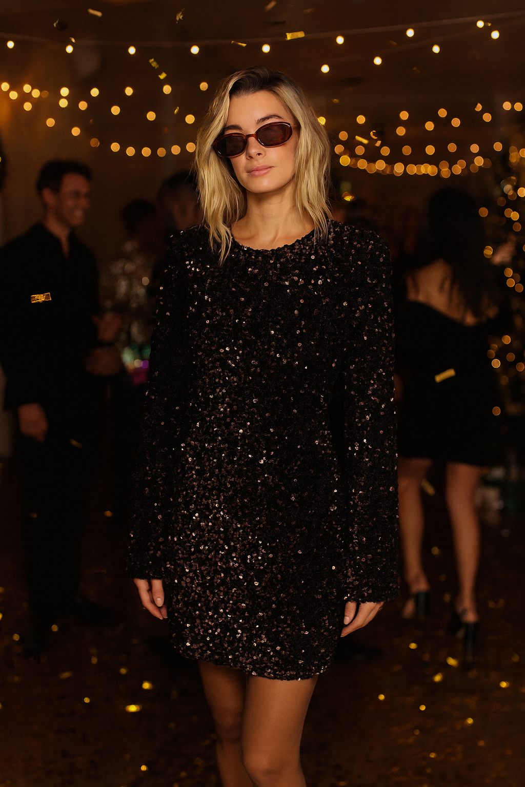 Modellen er 171 cm høy og bruker størrelse S. Jodyn Sequin Dress glitrer med heldekkende paljetter, og har stilige brede ermer for et dristig og uanstrengt elegant utseende.