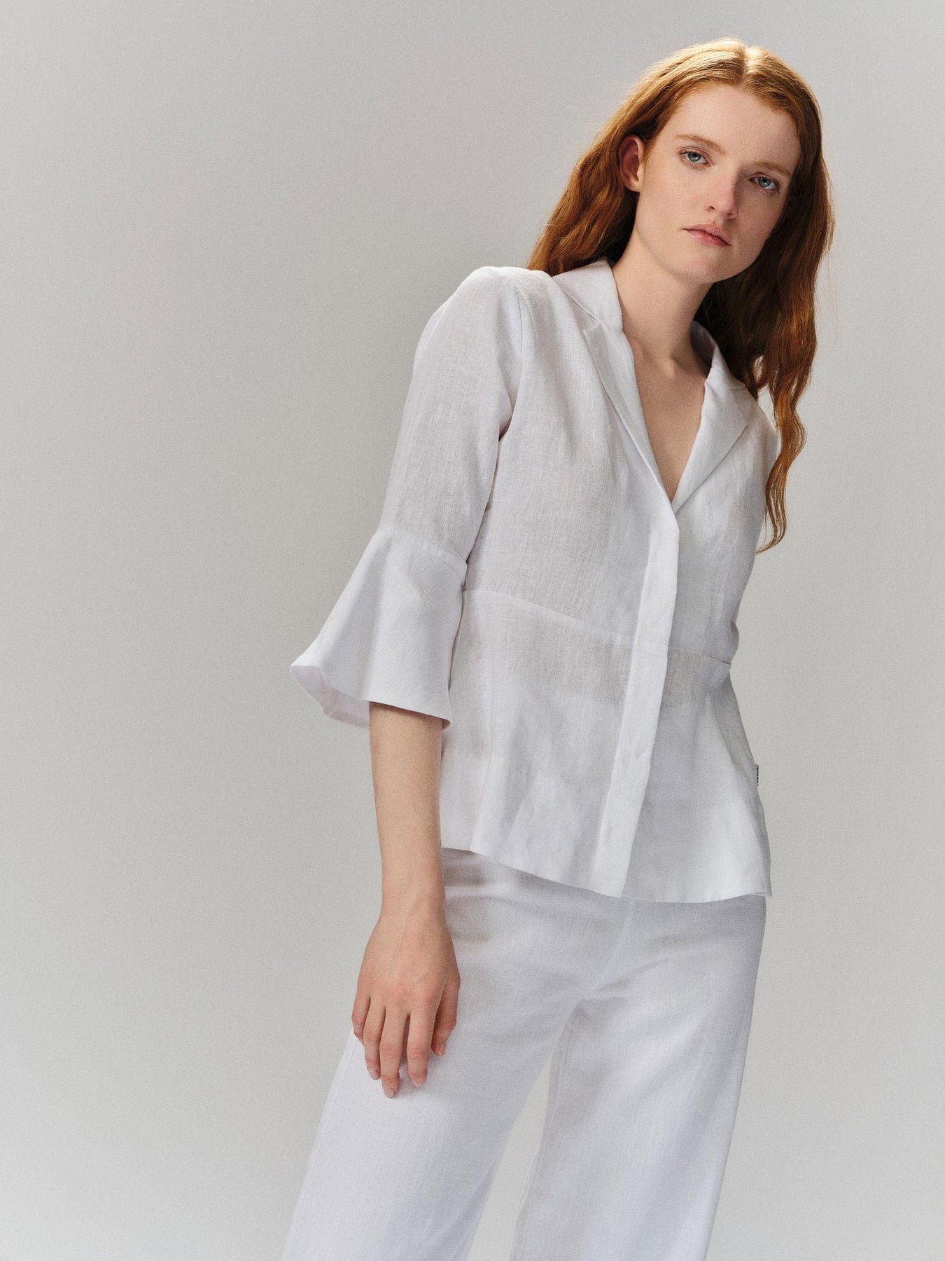 Guro lin skjorte er en elegant og lett skjorte som passer perfekt for varme dager. Den har en v-hals med krage, skjulte knapper foran og 3/4 trumpet ermer, noe som gir en sofistikert silhuett.