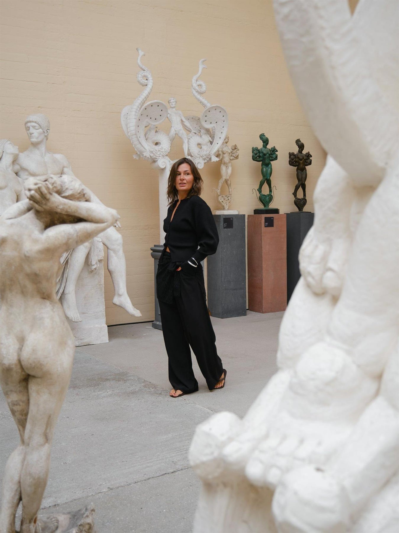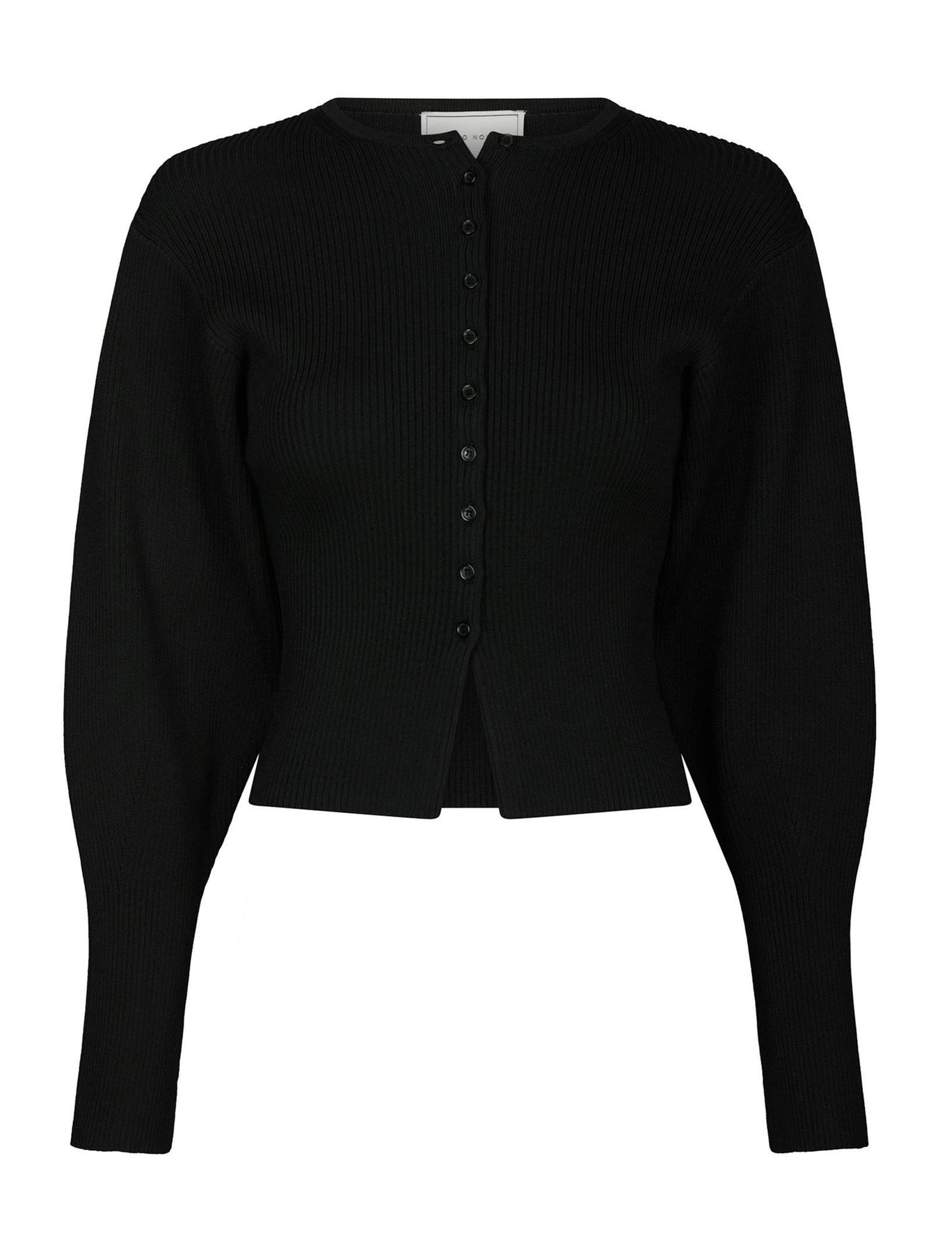 Langermet, strikket cardigan. Cardiganen har rund hals og knapper langs fronten. Den har brede skuldre og overarmer, og sitter tettere rundt midjen og ermet. Modellen er 176 cm og bruker størrelse 36.