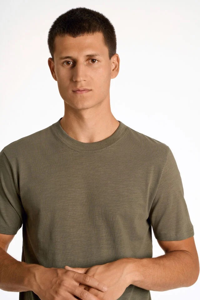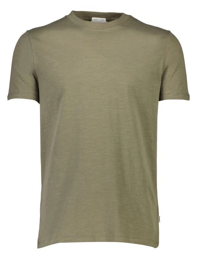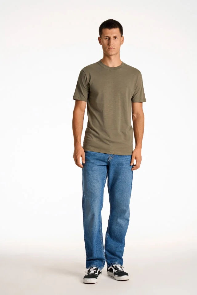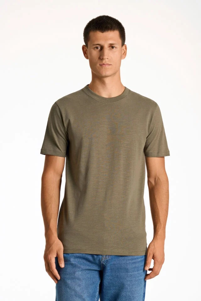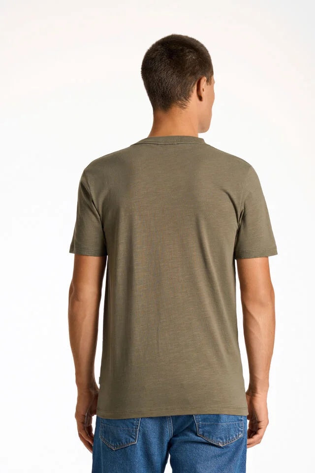 T-skjorte med rund hals. T-skjorten er laget av 100 % økologisk bomull og har en logolapp nederst til venstre. Laget i en avslappet passform, som er litt strammere enn vanlig passform, men som fortsatt gir rom for bevegelse.