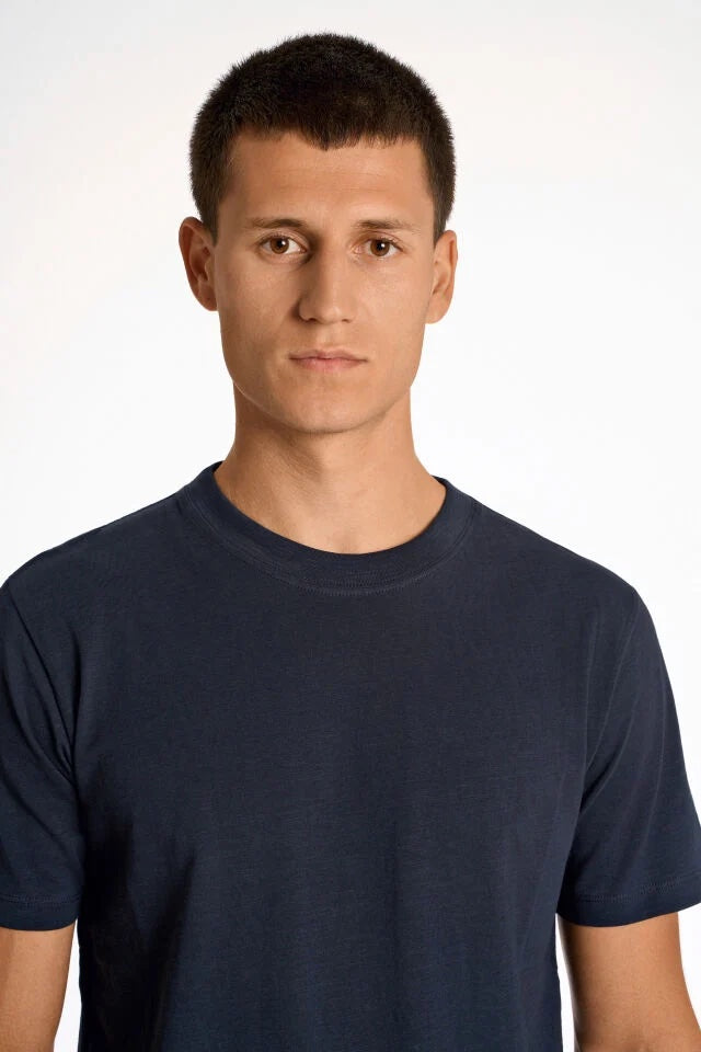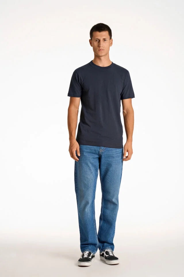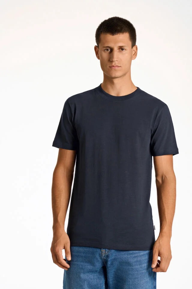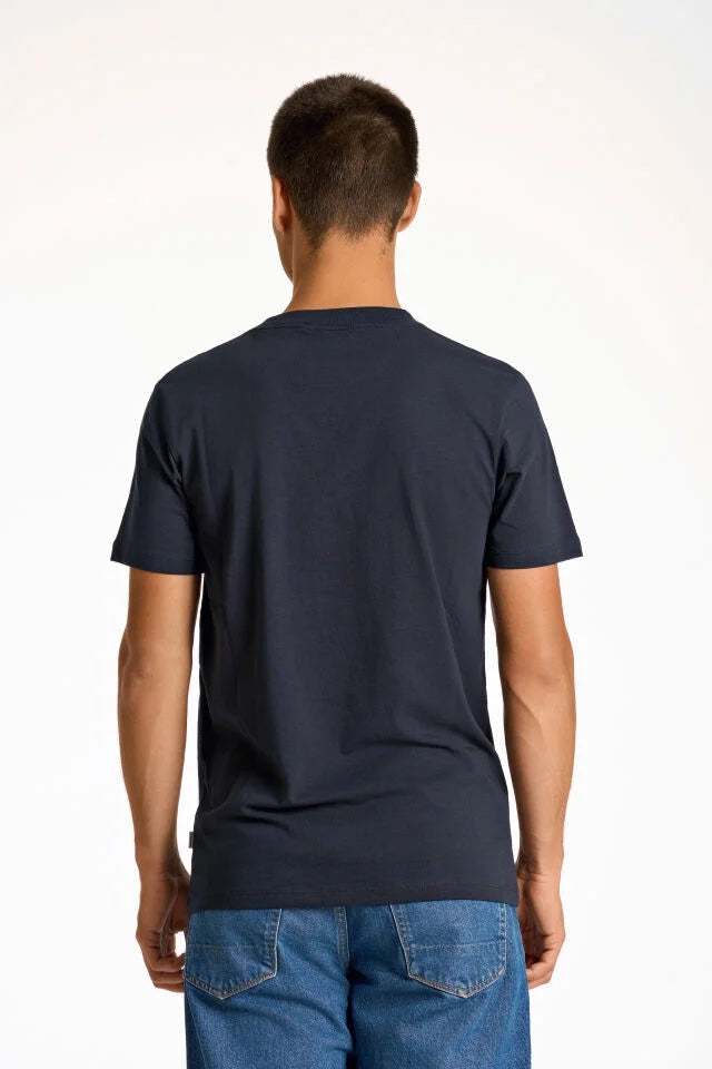 T-skjorte med rund hals. T-skjorten er laget av 100 % økologisk bomull og har en logolapp nederst til venstre. Laget i en avslappet passform, som er litt strammere enn vanlig passform, men som fortsatt gir rom for bevegelse.