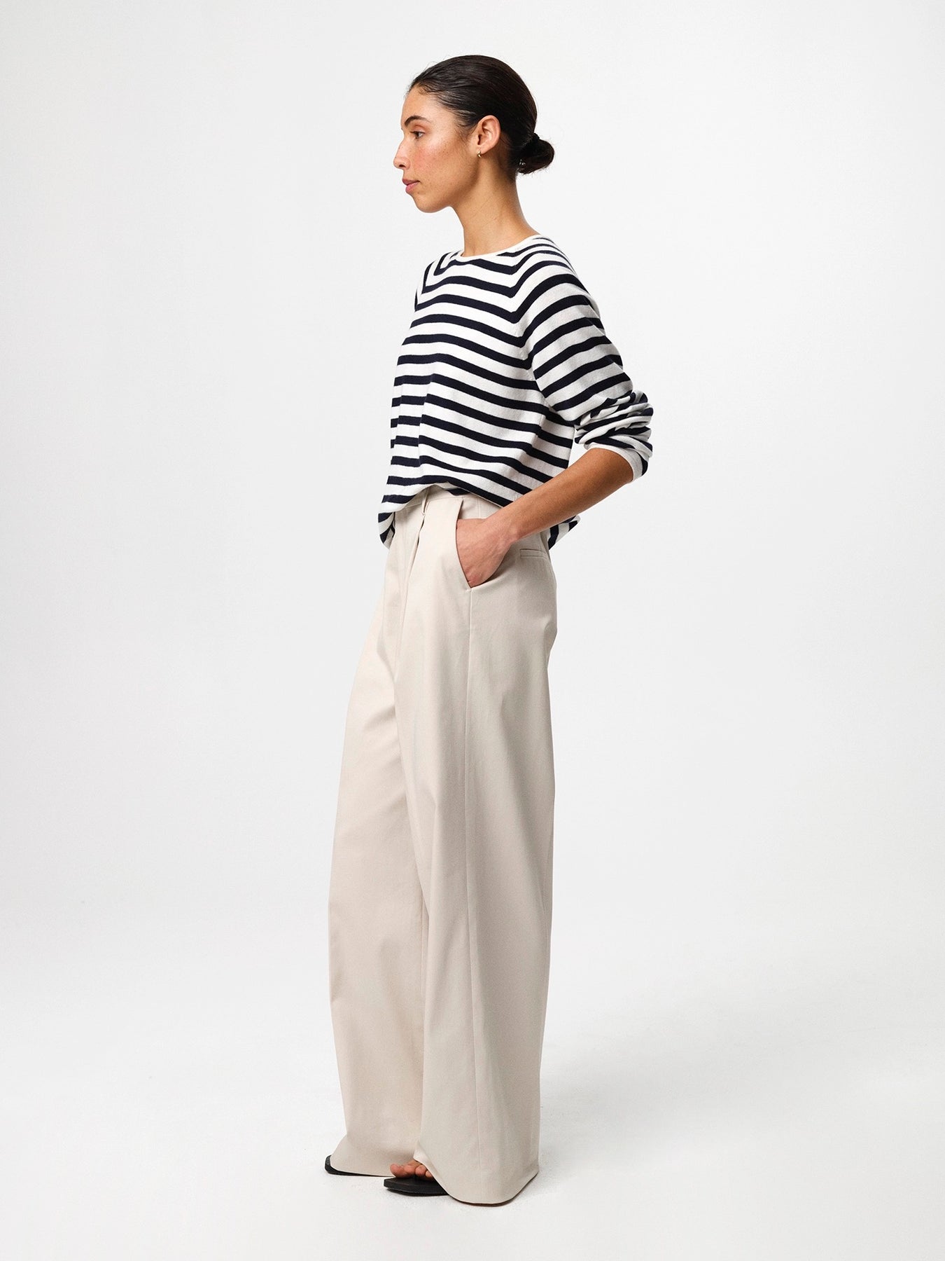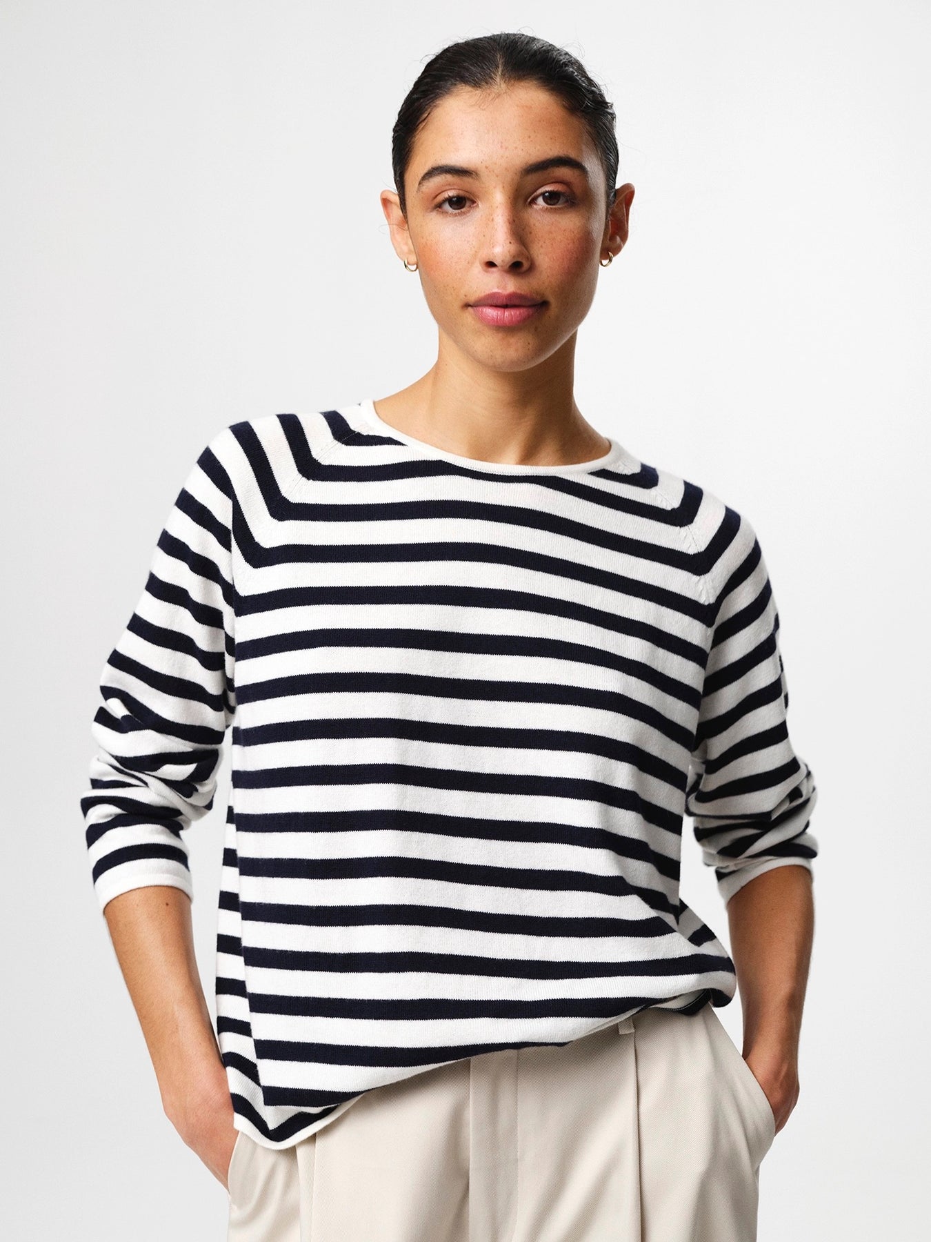 Kate V-Neck er en raffinert hverdagsstrikk designet for enkel lag-på-lag-på-lag-løsning. Laget av en myk ull- og bomullsblanding, kombinerer den den naturlige varmen fra ull med lettheten og pustende egenskaper fra bomull. Den avslappede silhuetten er avsluttet med en ren V-hals og diskrete, senkede skuldre for en diskré, moderne følelse. Style den over en T-skjorte eller bruk den alene med skreddersydde bukser eller denim.