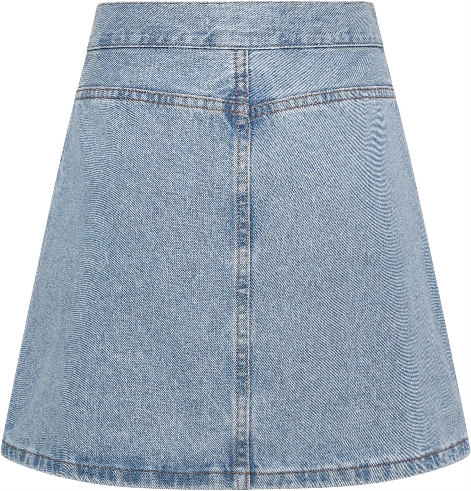 Daan fra Lois Jeans er et klassisk denimskjørt i en lys blå vask som enkelt kan styles til både hverdag og mer pyntede anledninger. Miniskjørtet har en flatterende A-formet passform med høyt liv som gir en feminin og tidløs silhuett. En markert sømdetalj i midten både foran og bak gir designet et stilrent preg. Skjørtet har klassiske frontlommer, hvor den ene er dekorert med den ikoniske Lois-logoen, mens baksiden har rene lommesømmer som gir et minimalistisk uttrykk.