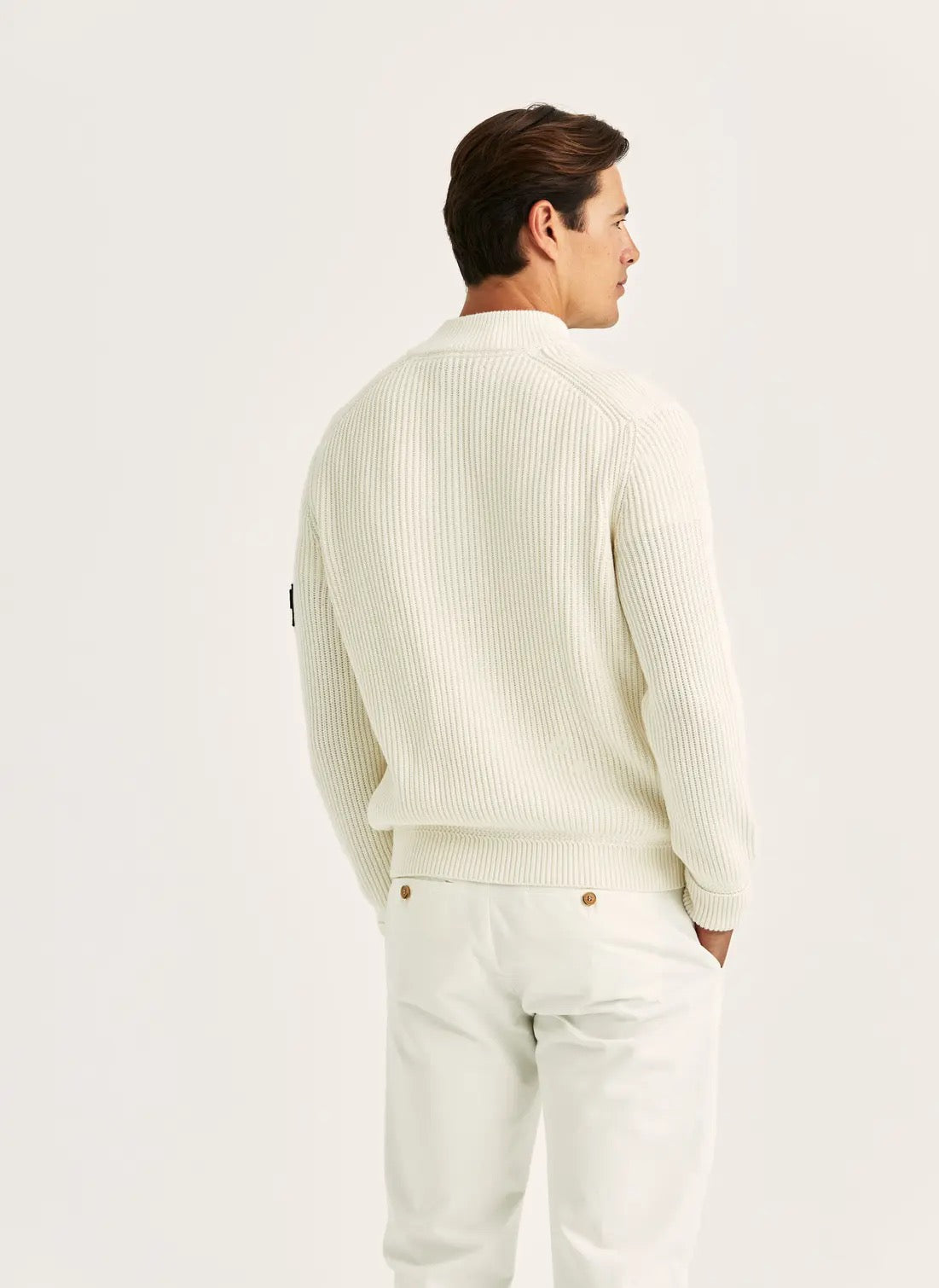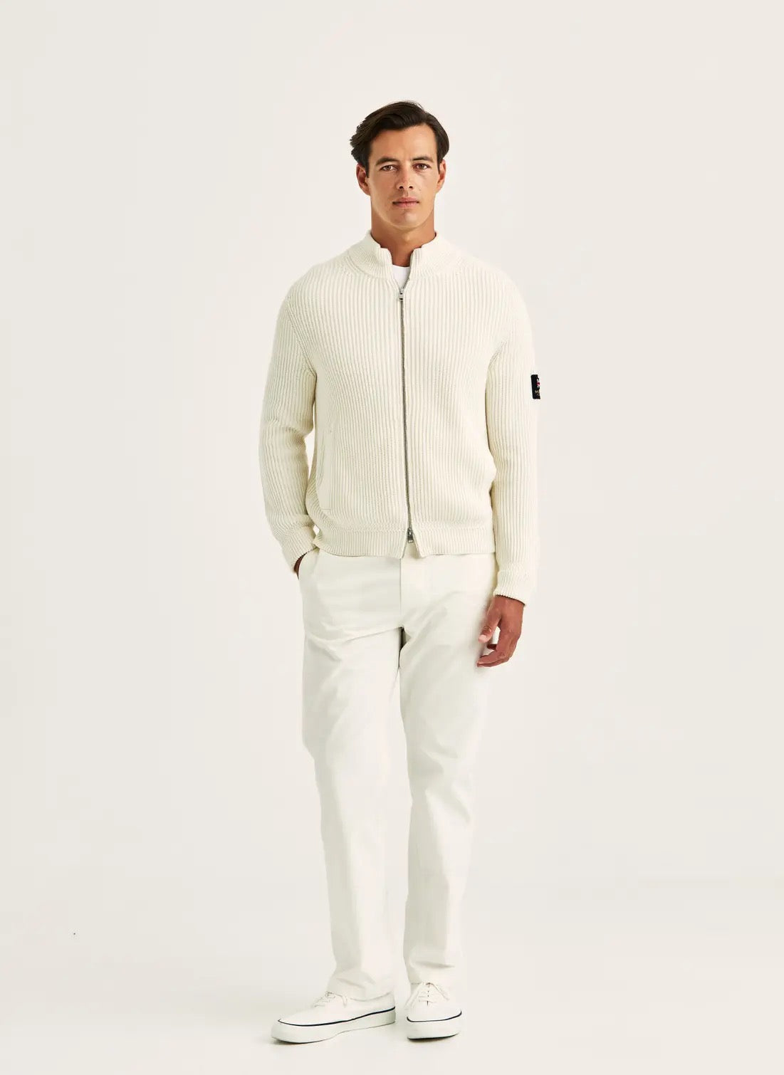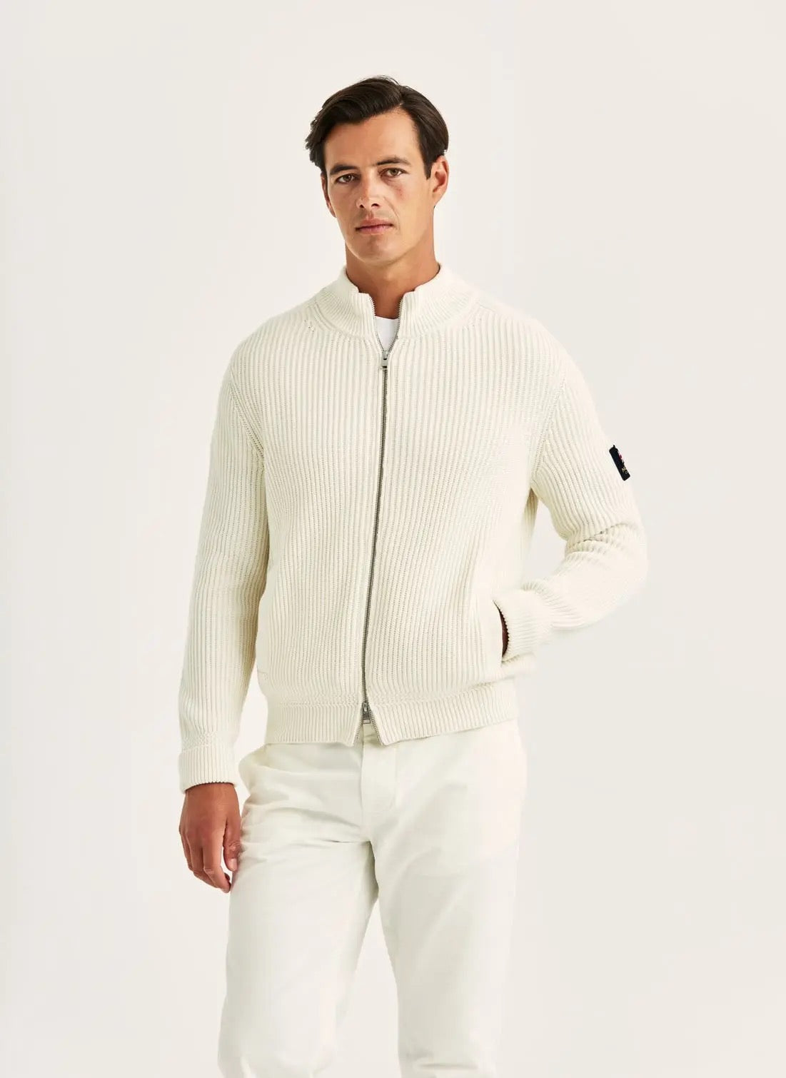 En moderne klassiker med en sporty karakter. Brenton Zip Cardigan har en ikonisk engelsk ribbestrikkstruktur med en solid, luksuriøs følelse. Den stående kragen, den robuste YKK-glidelåsen og den rene ribbestrukturen skaper en skarp og selvsikker silhuett. Med vertikale håndlommer og en diskré flagglapp på siden balanserer dette plagget eleganse og komfort i et tidløst hverdagsdesign.