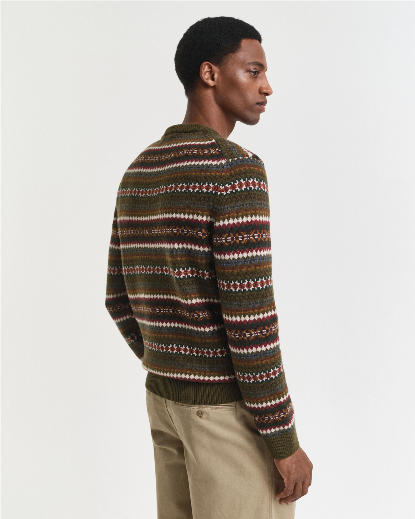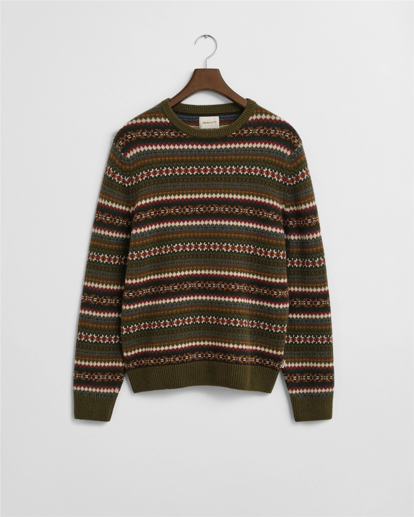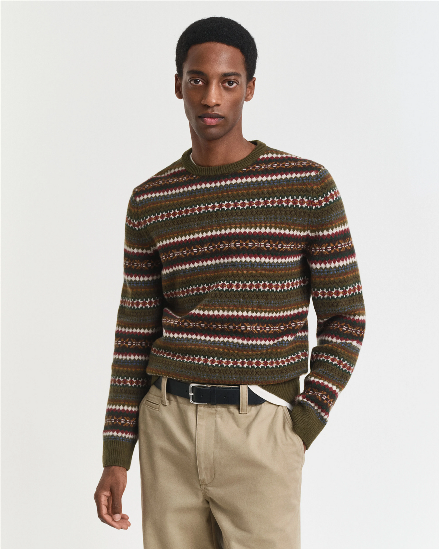 Denne genseren er strikket med et tradisjonelt Fair Isle-mønster og er laget av en myk italiensk ullblanding. Et koselig vinterplagg som er perfekt for høytiden, designet for en normal passform og har rund hals og ribbekanter.