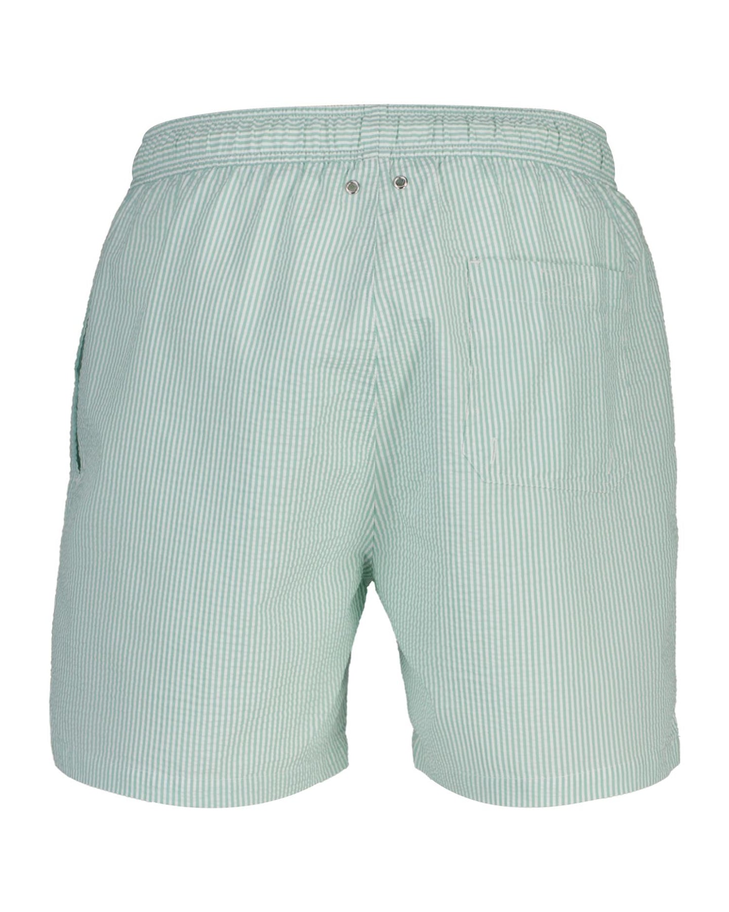 Disse badeshortsene er laget av en resirkulert polyesterblanding og mønstret med en sesongbasert seersucker-stripe. De er laget for en vanlig passform, har et middels langt snitt og en vanlig midje, med en elastisk linning med snøring. Disse shortsene er utstyrt med sidesømlommer, en baklomme og vår ikoniske skjoldlogo brodert på beinet.