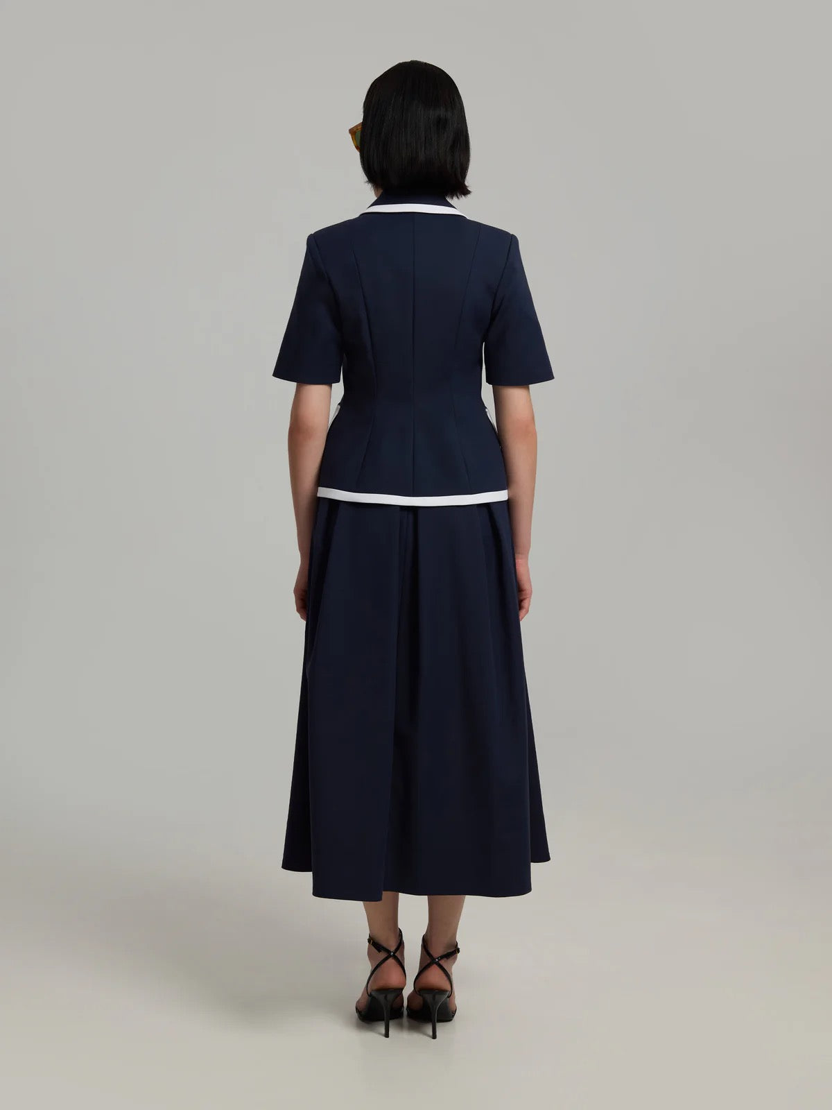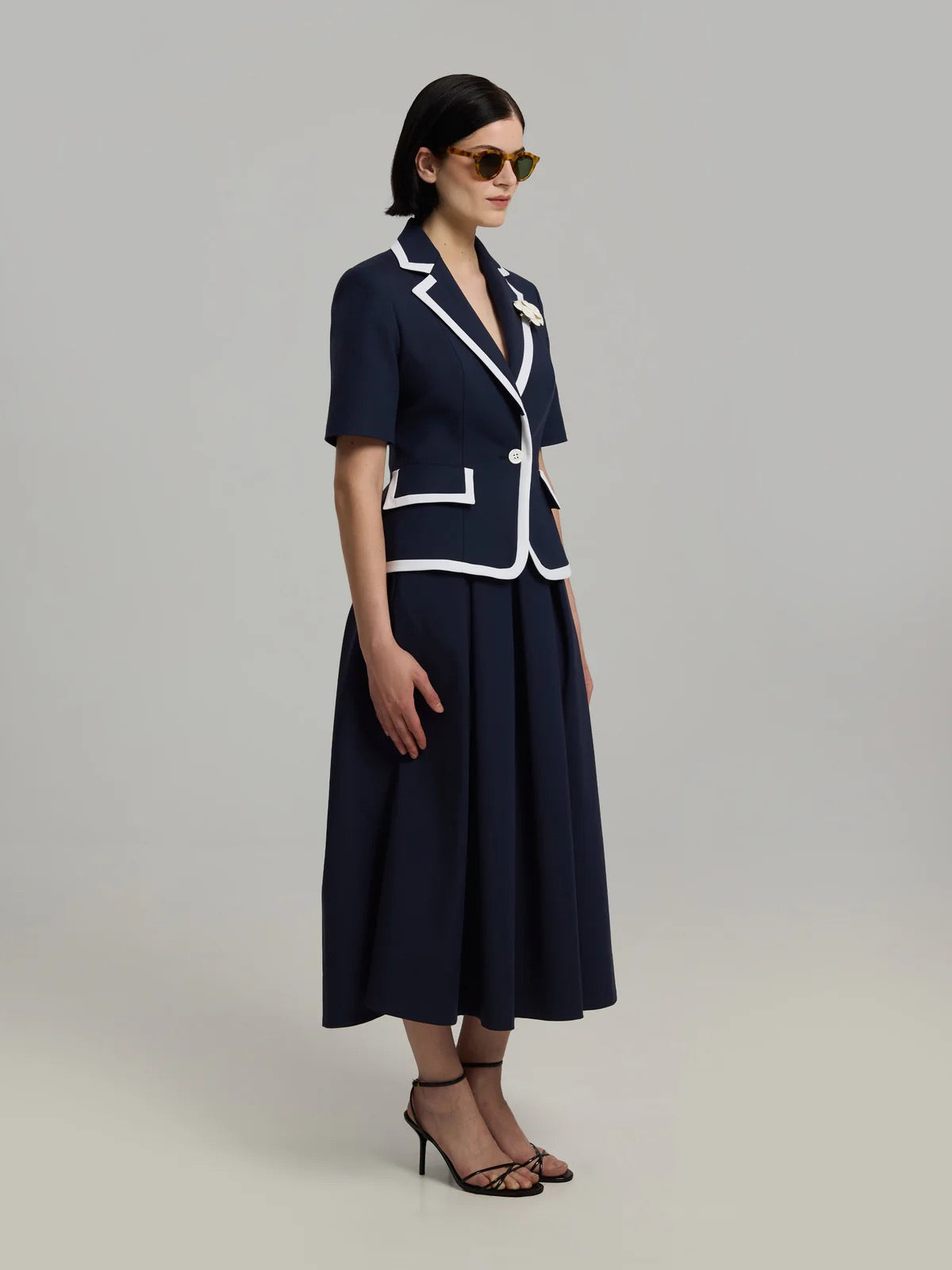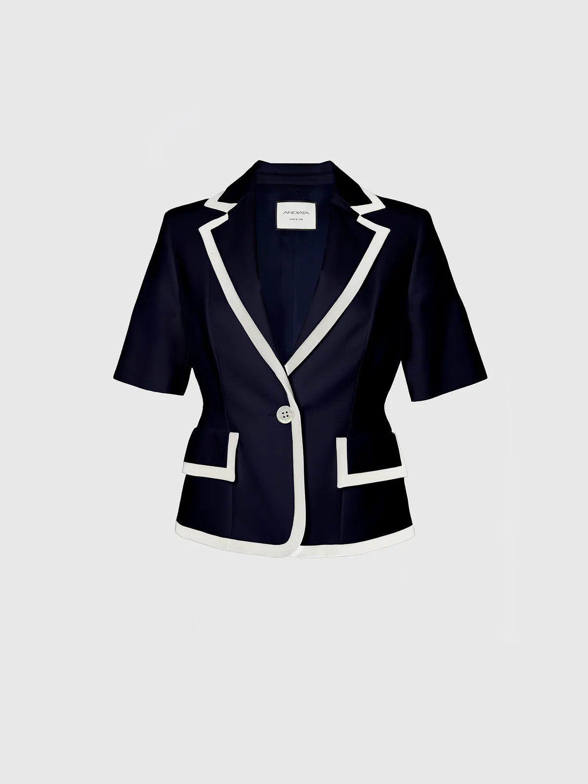 Tettsittende blazer med korte ermer. Designet har hvite kontrastpipinger, lommer med klaff foran og knappelukking. Laget av en førsteklasses italiensk bomullsblanding. Blazeren er fôret.