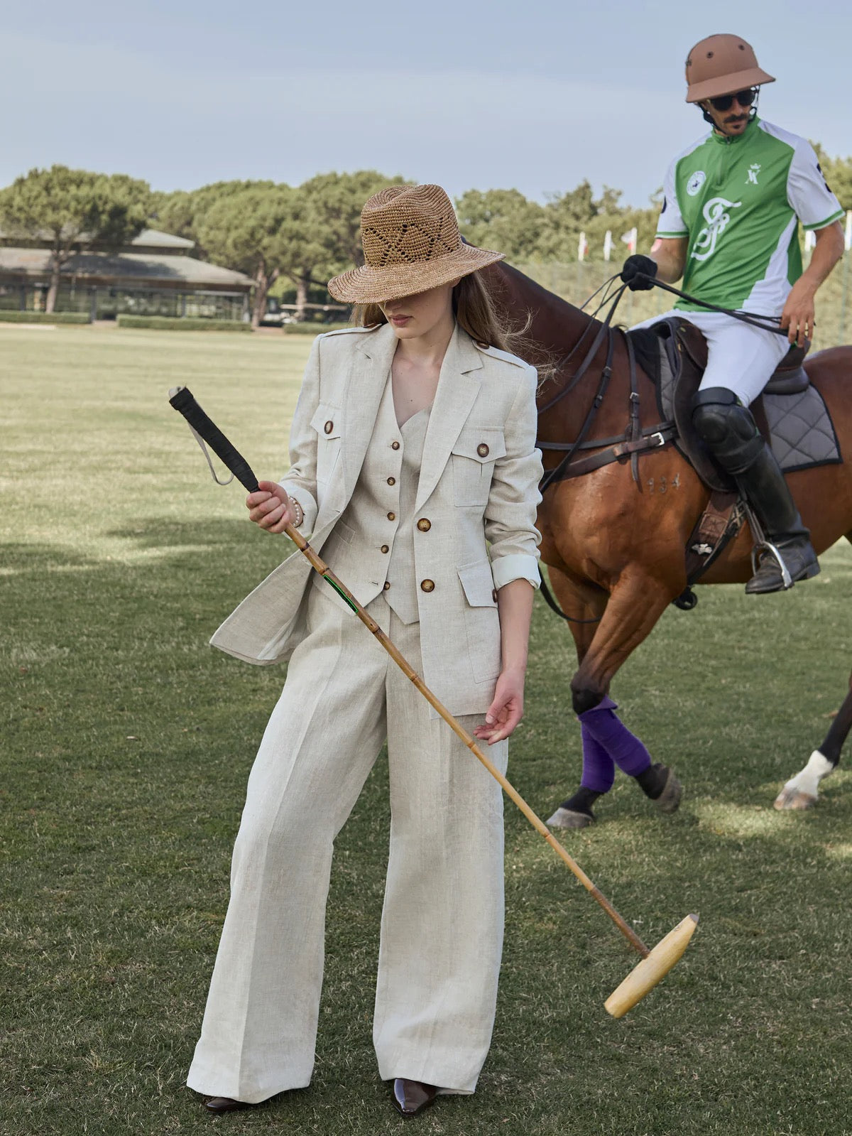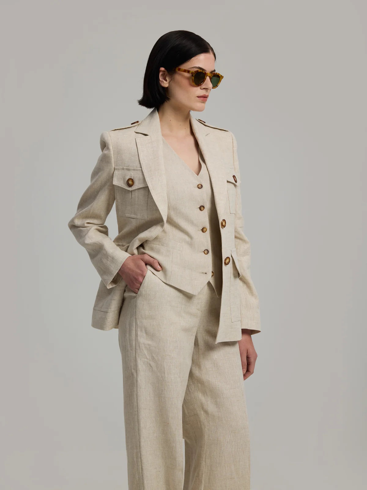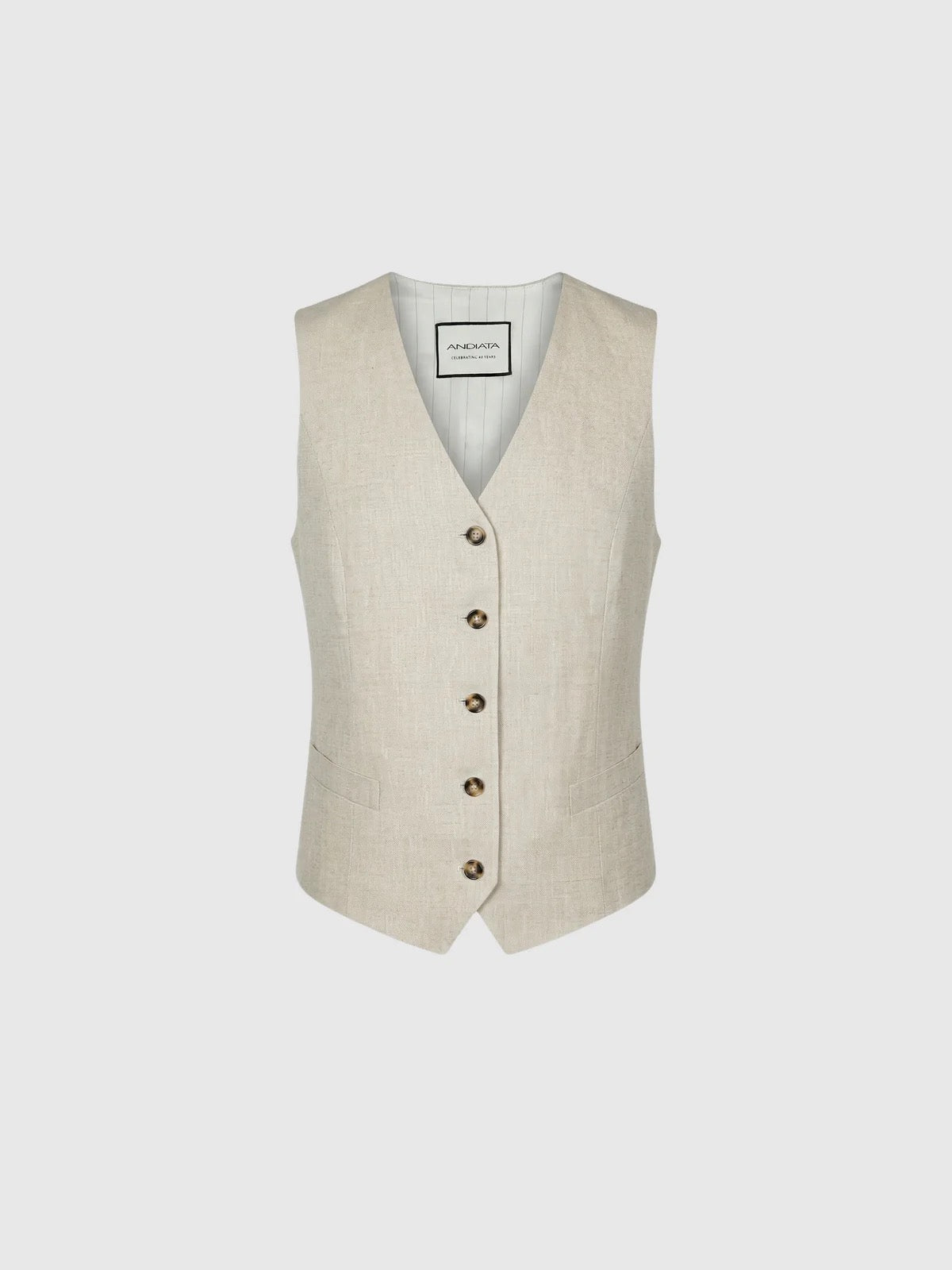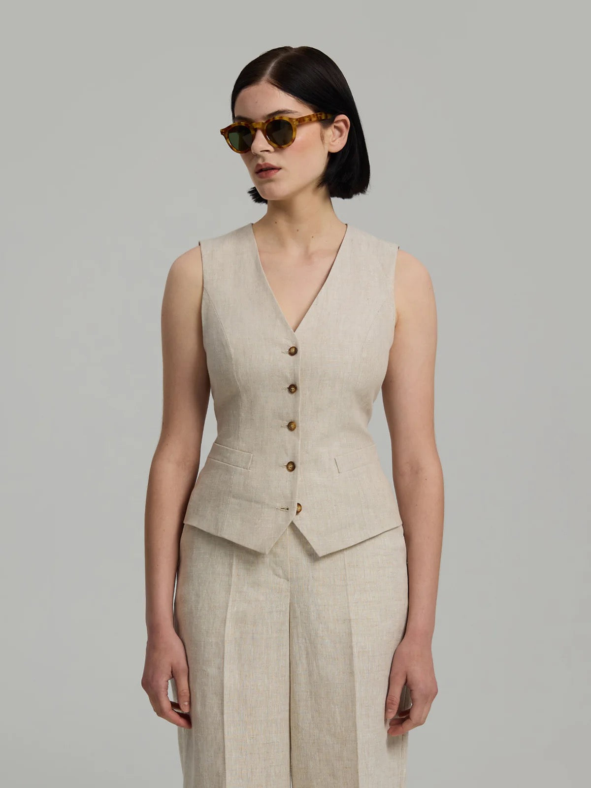 En skreddersydd, smal passform vest laget av italiensk lin av høy kvalitet. Stoffets naturlige tekstur gir plagget et raffinert, men likevel avslappet utseende, noe som gjør det enkelt å style til både formelle og uformelle anledninger. Bruk med matchende Gisella Linen-bukser.