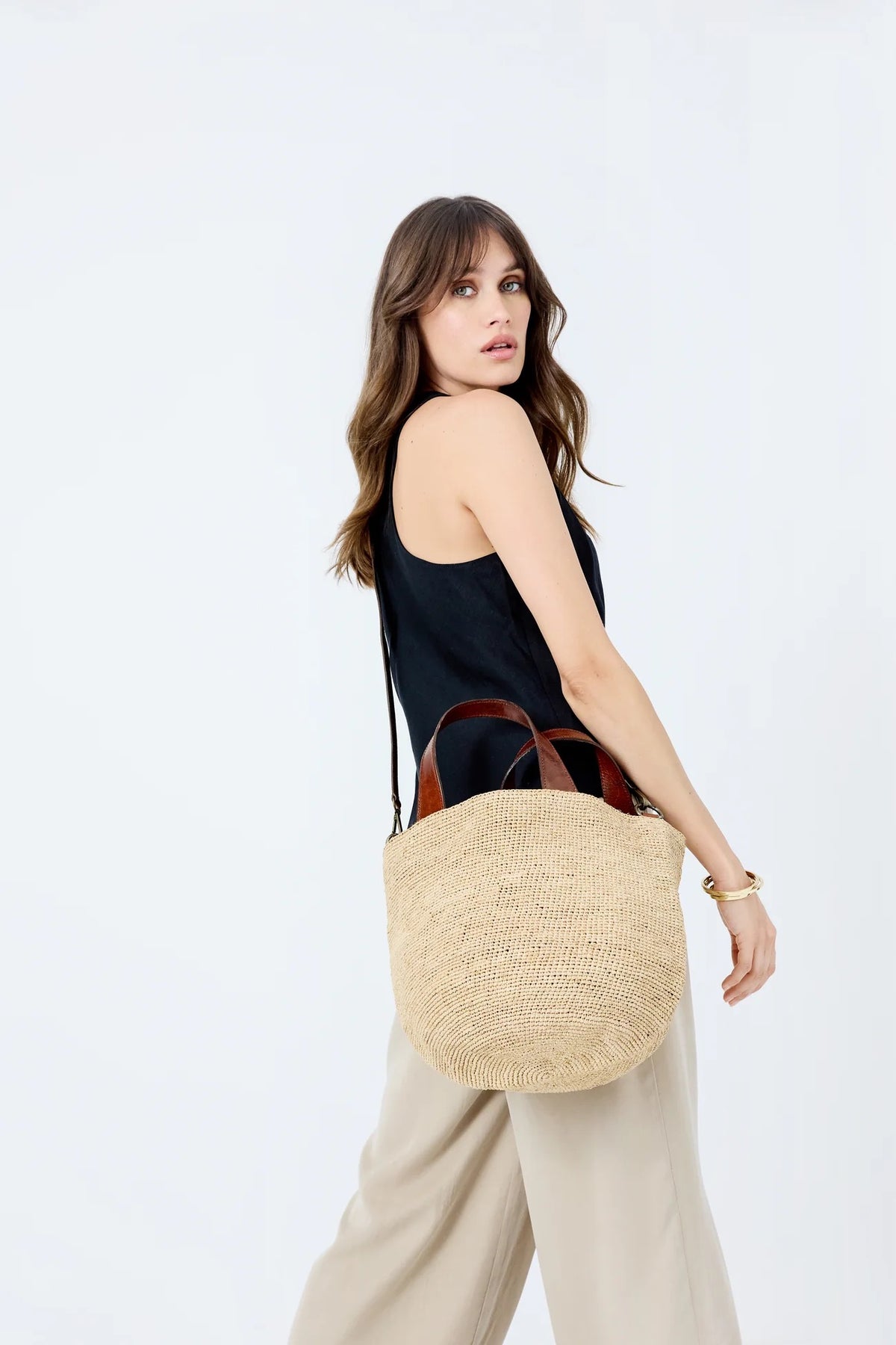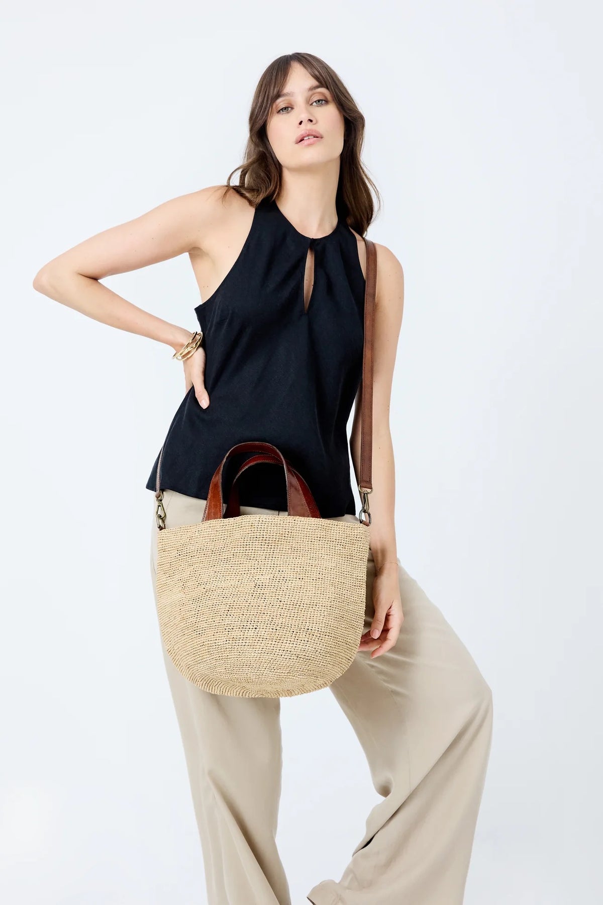 Materialer: Denne vesken er laget av 100 % naturlig raffia. De to håndtakene og den avtakbare skulderremmen er laget av zebu-skinn garvet med en vegetabilsk prosess.