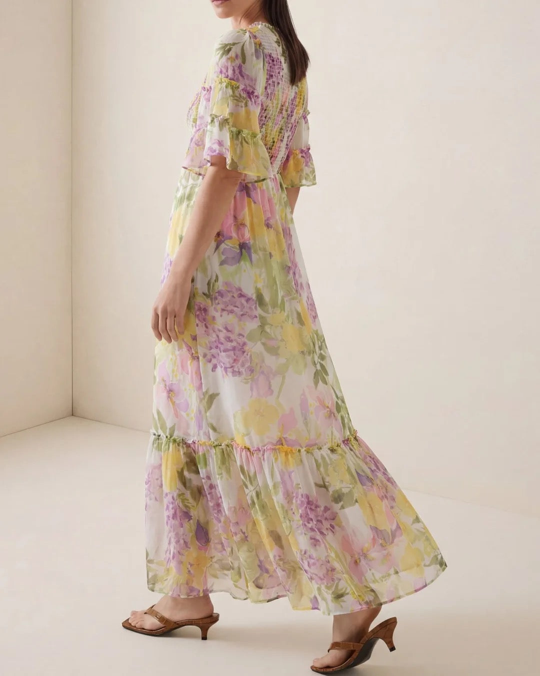 Organza Smocking-kjolen er laget av vår elegante og lett gjennomsiktige, FSC-sertifiserte viskosekvalitet. Kjolen har en maxilengde, en tettsittende topp laget av smocking og har V-hals og knapper ned langs brystet. Den har høy midje og albuelengde, utsvingte ermer med dekorative rysjer. Den har glidelåslukking i siden.