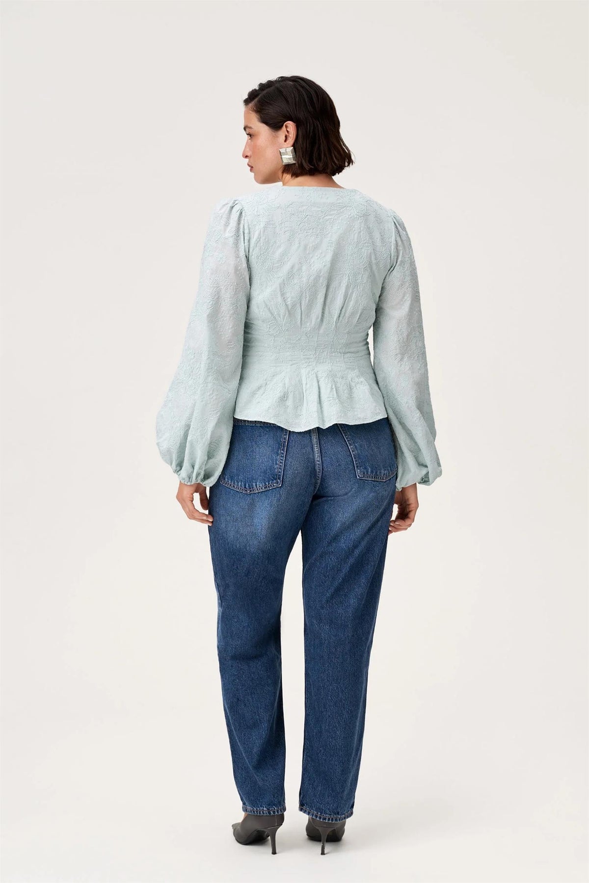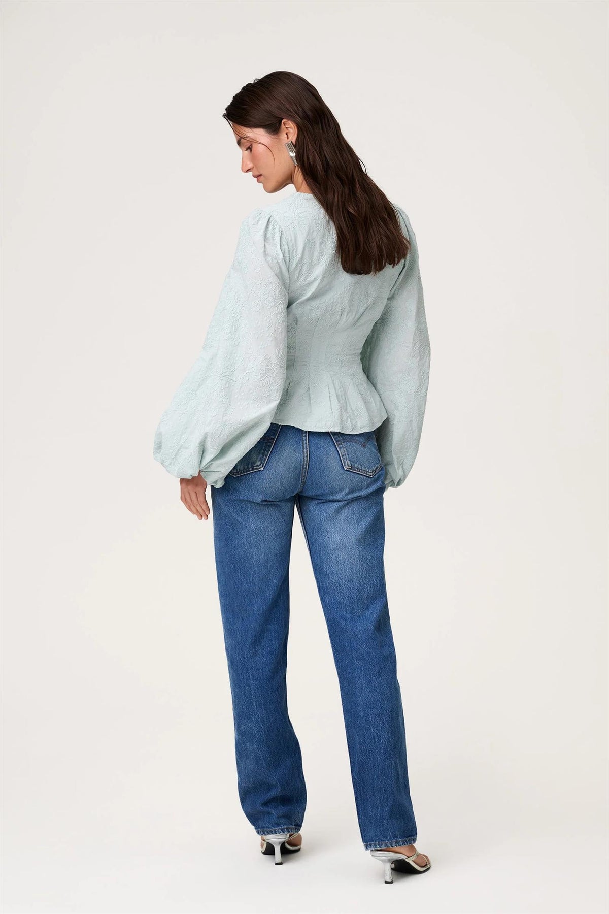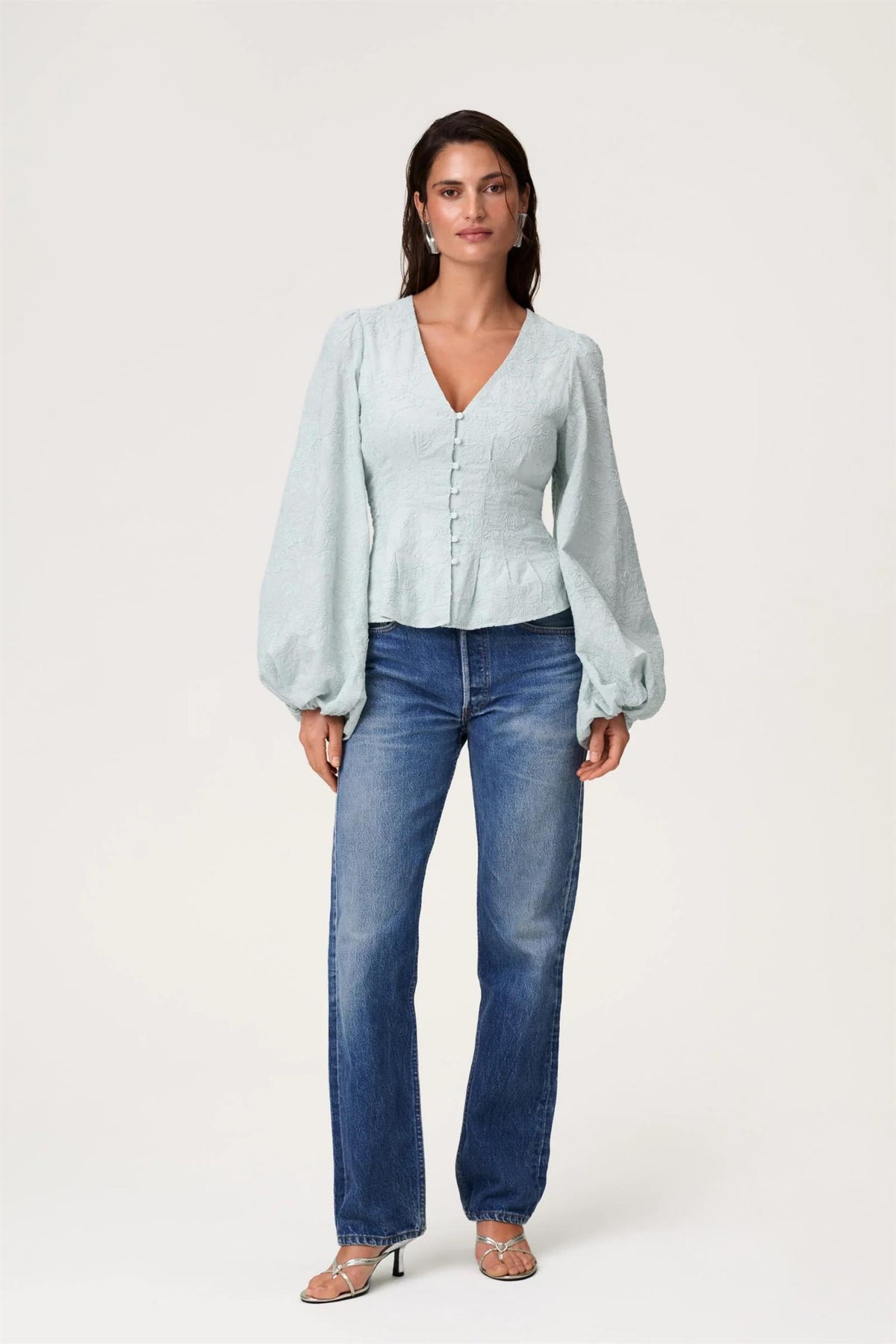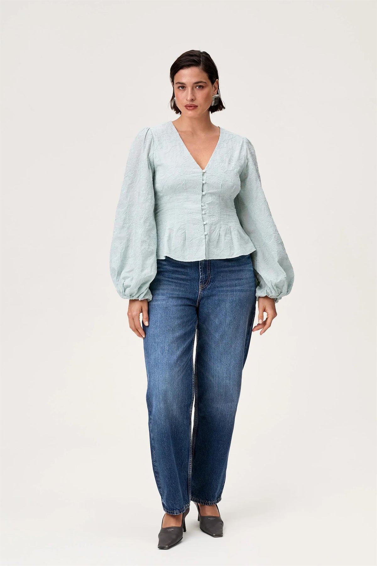 Palena-bluse i mintgrønn broderi har knapper og splitter foran, markante lange ermer og en V-halskrage. Helfôret overdel. Designet for å være slankere i midjen for å fremheve figuren.