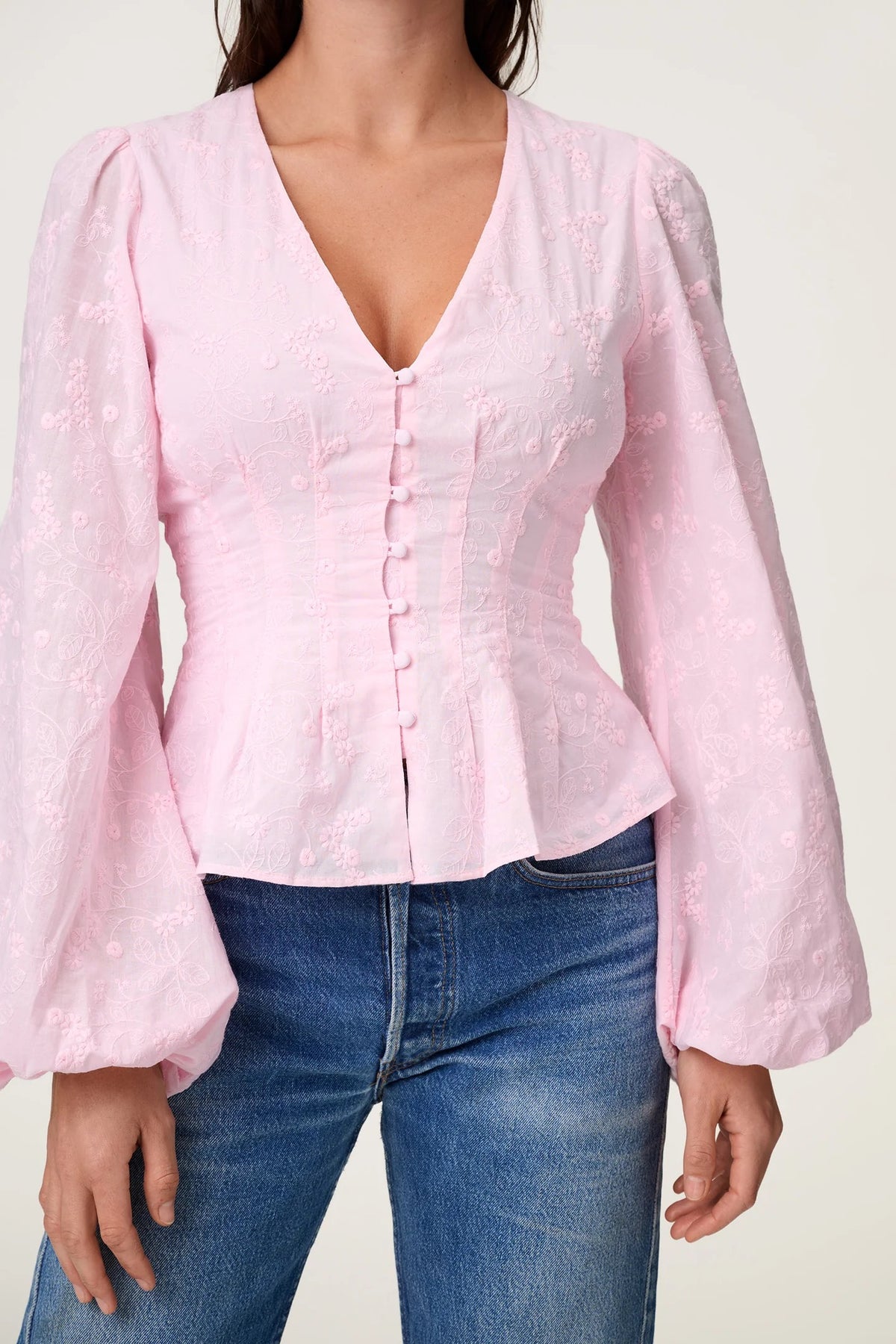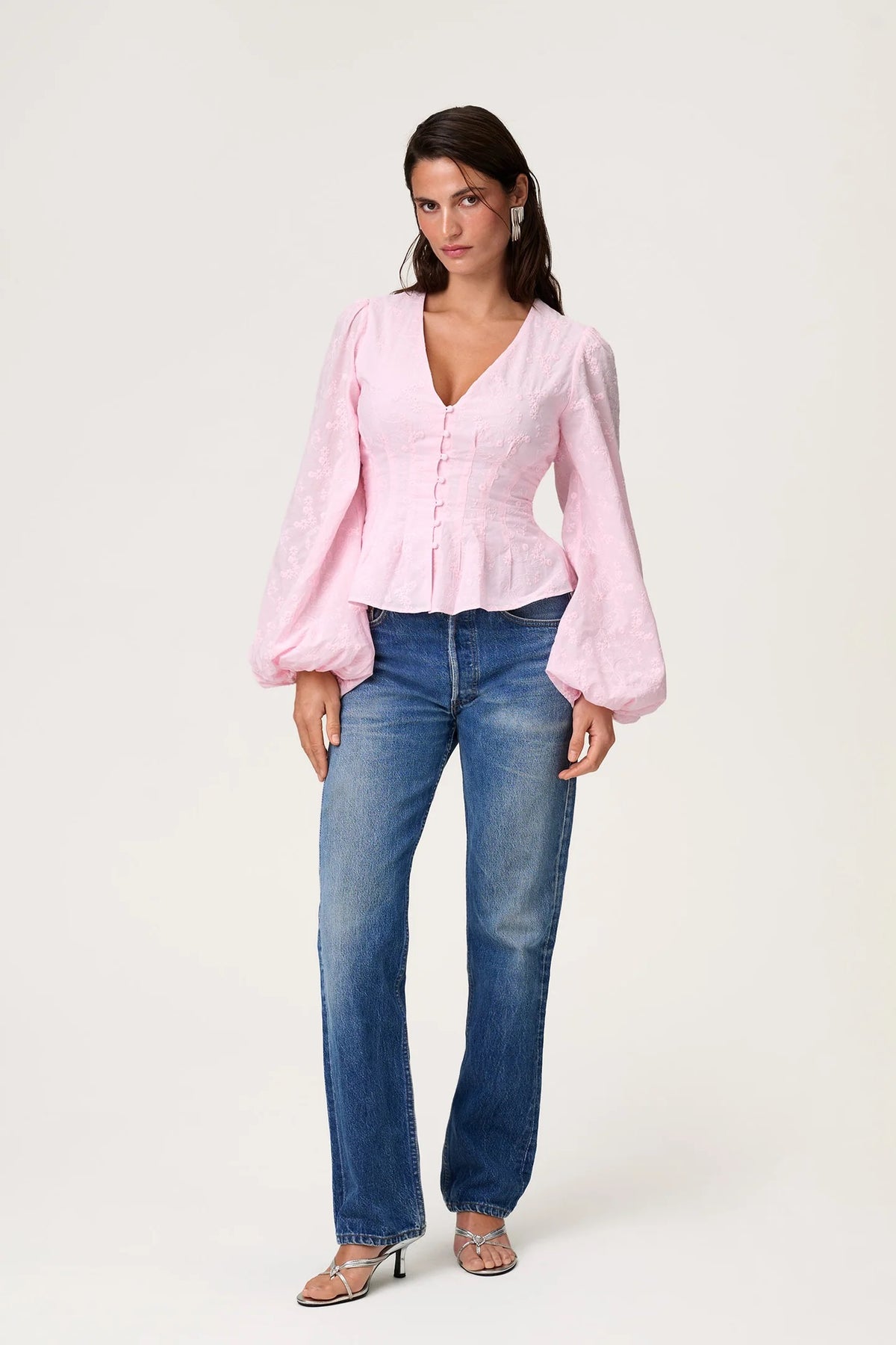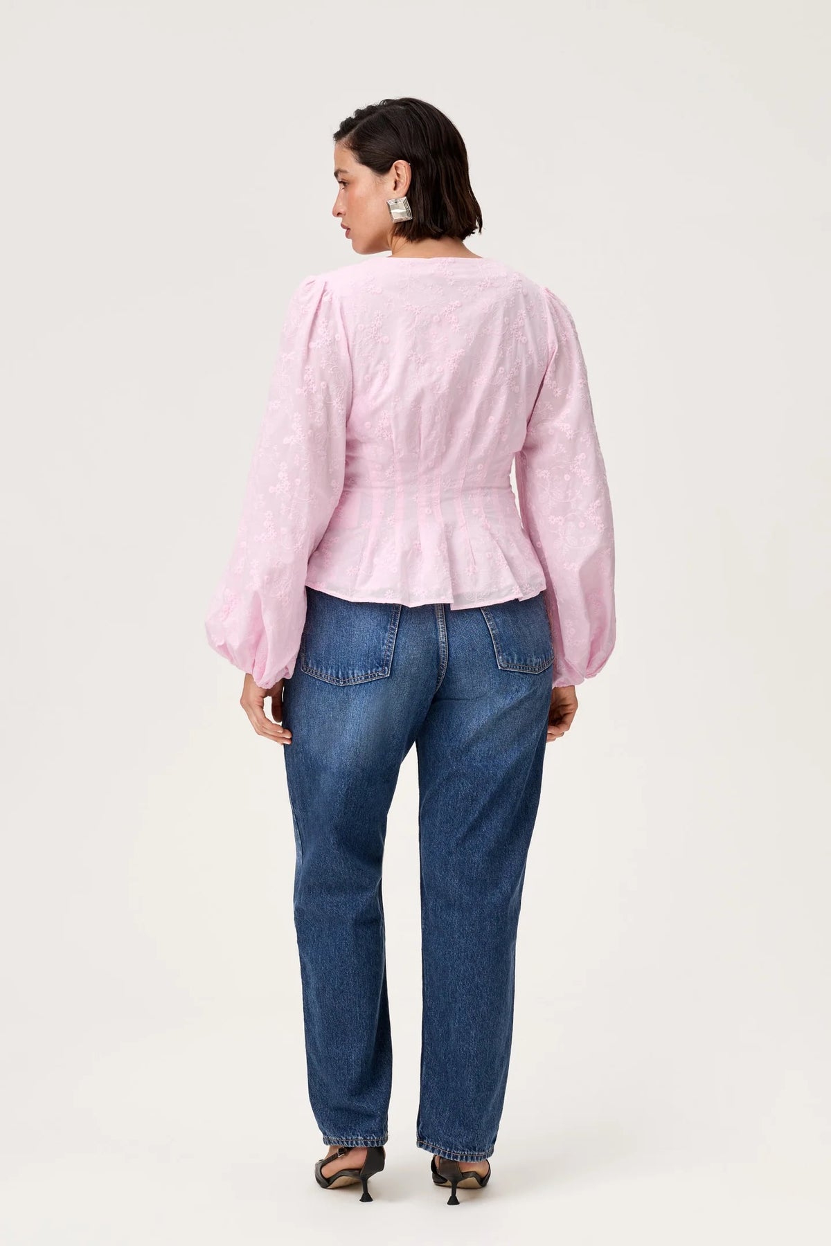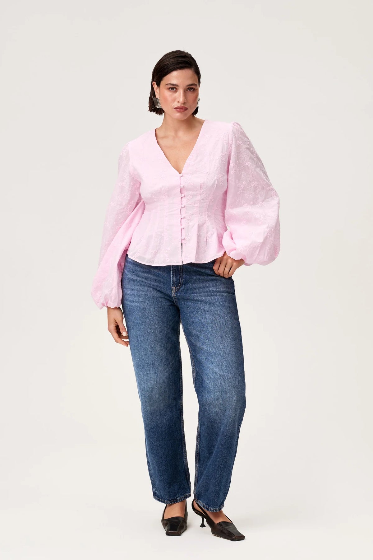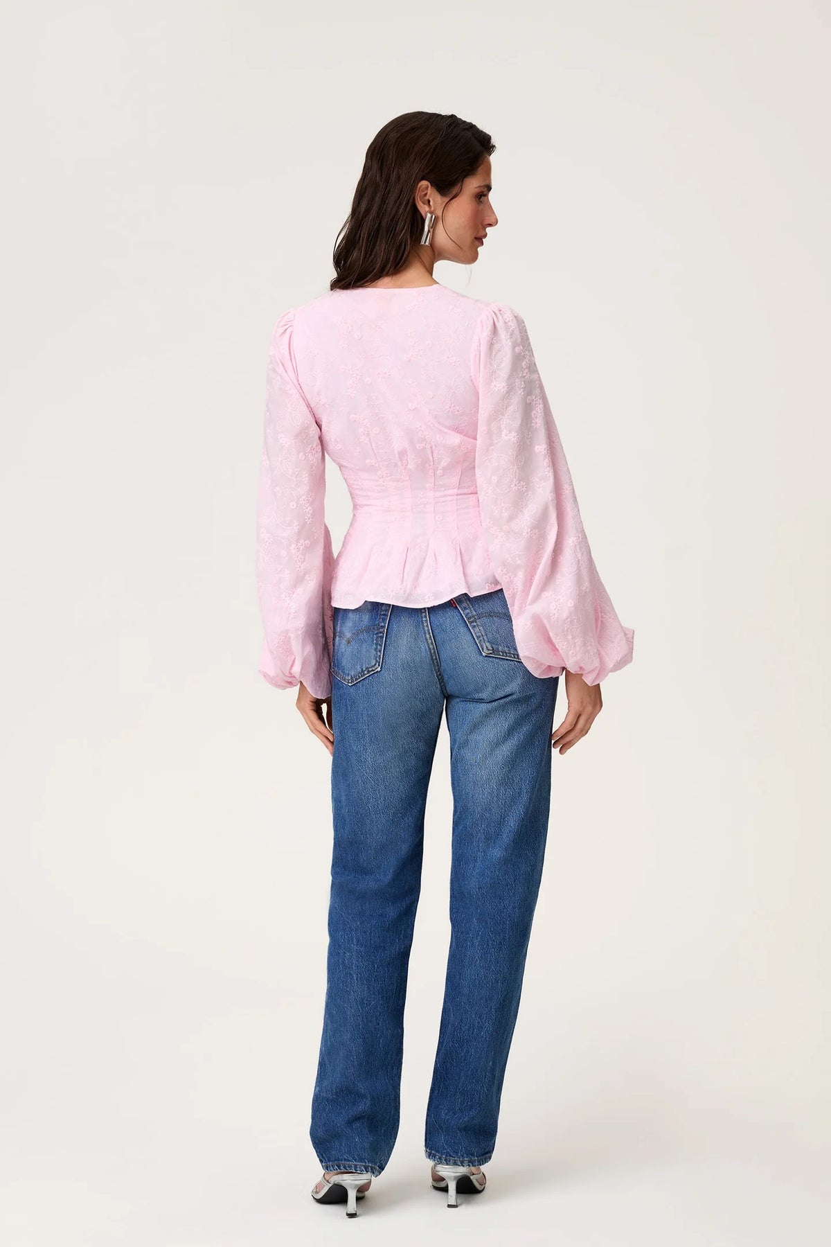 Palena-bluse i rosa broderi har knapper og splitter foran, markante lange ermer og en V-halskrage. Helfôret overdel. Designet for å være slankere i midjen for å fremheve figuren.