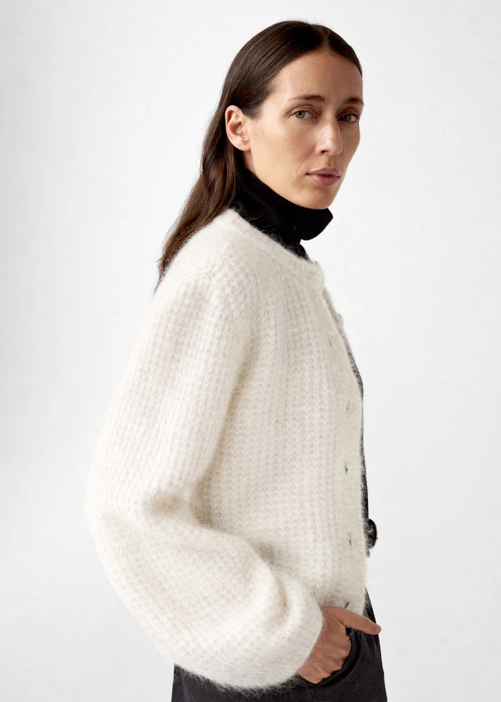 Sofia Mohair Cardigan er laget i vaffelstrikket struktur. Den har knappelukking foran og store ballongermer, noe som gjør den til den perfekte cardiganen med litt ekstra stil for ethvert antrekk.