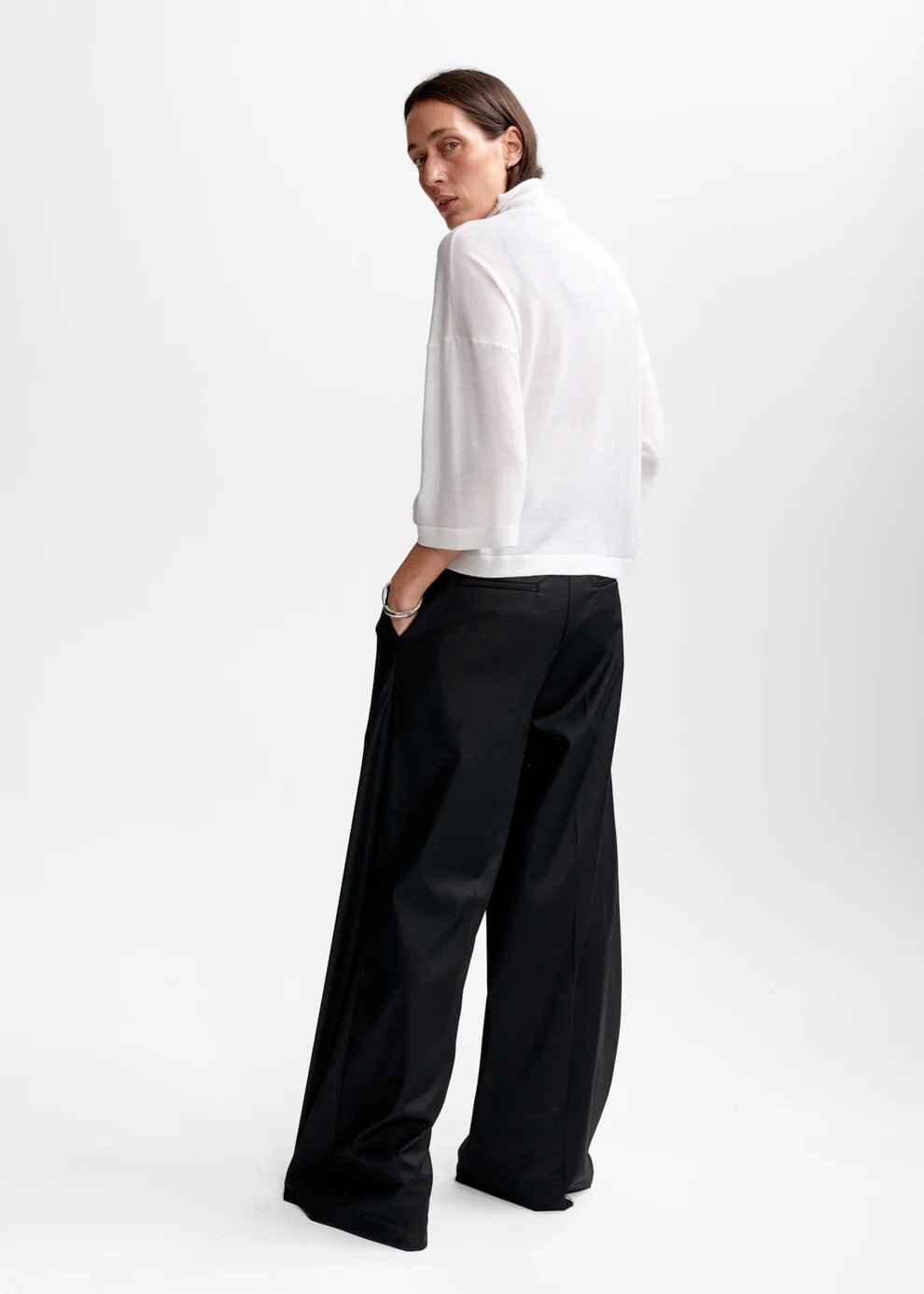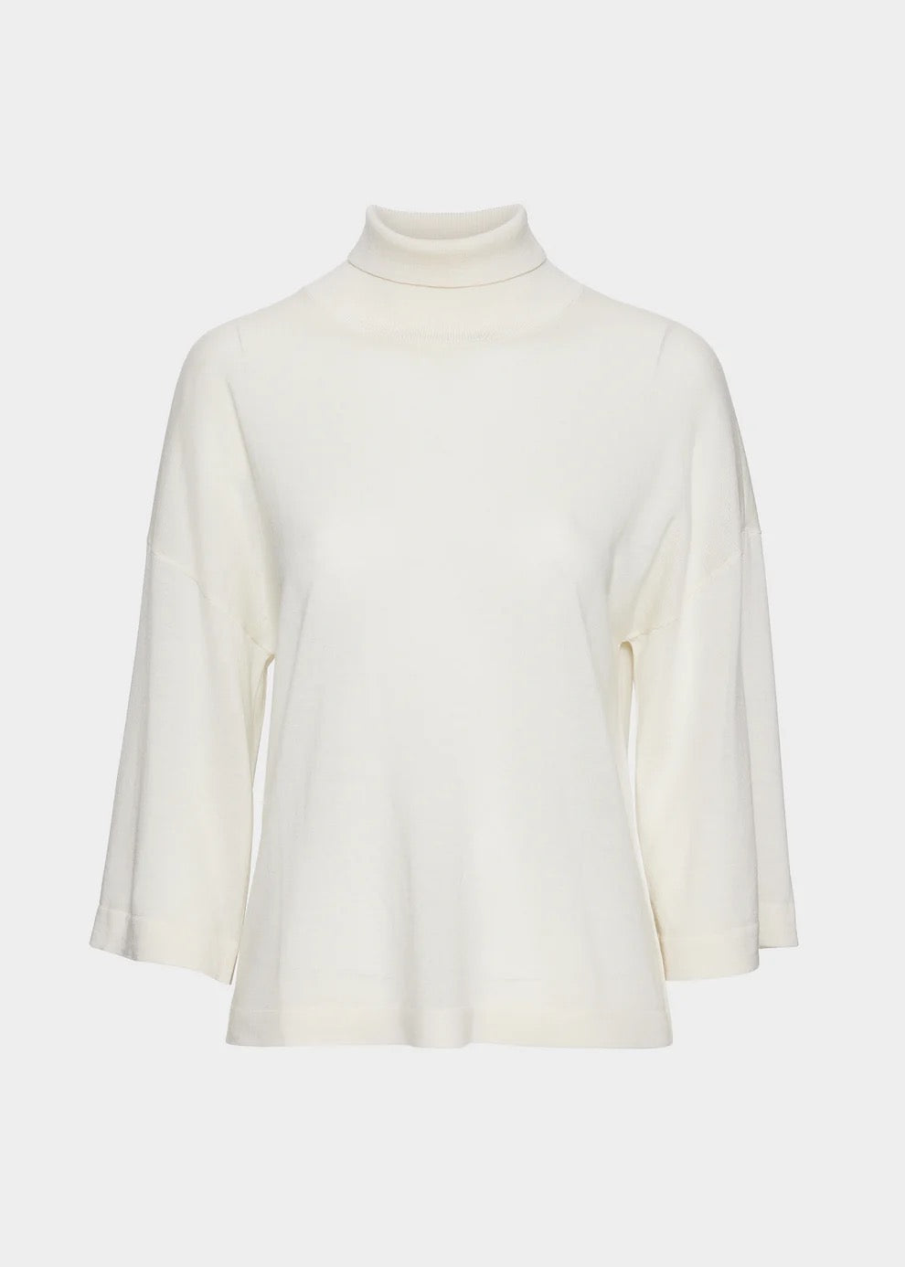 Tia merinoull er strikket i supermyk, fin merinoull. Passformen er rett, firkantet passform med løse ermer over albuen og en klassisk polokrage i fin ribbestruktur.
