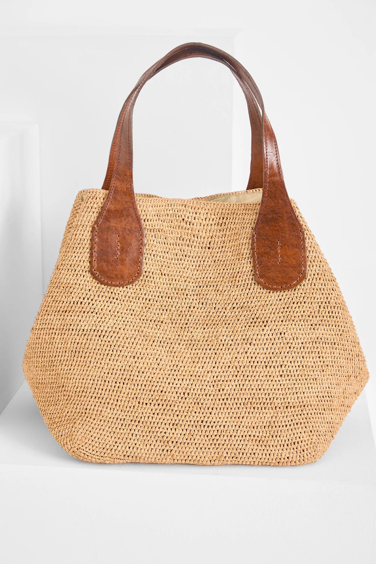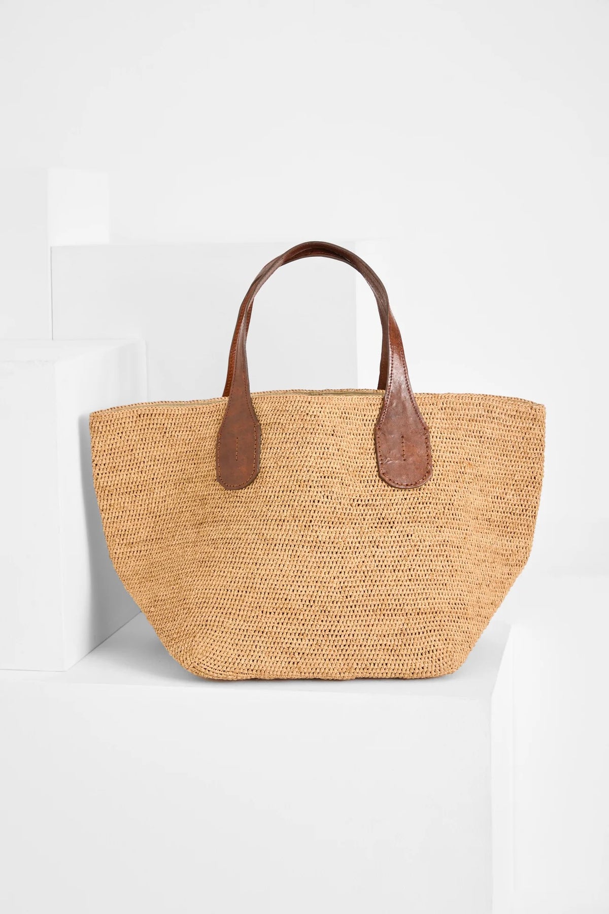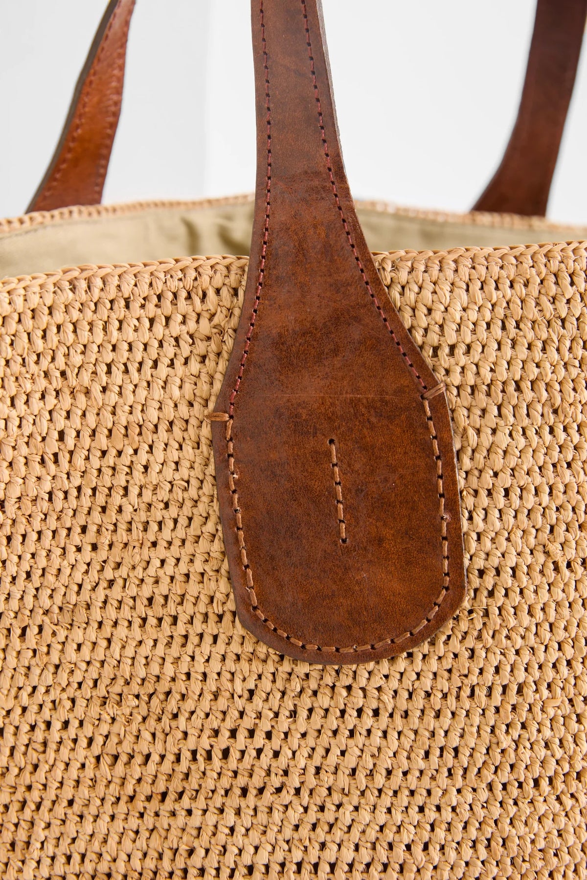 Materialer: 100 % naturlig raffia og fôret med økologisk bomull. De to håndtakene er laget av vegetabilsk garvet zebu-lær.
