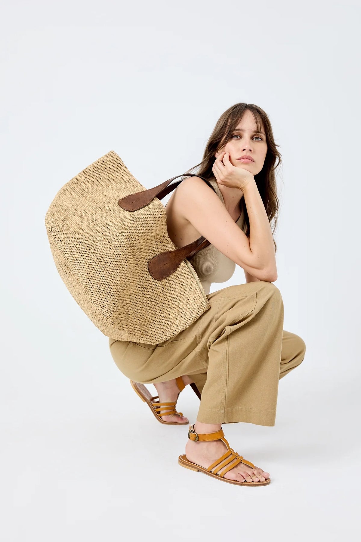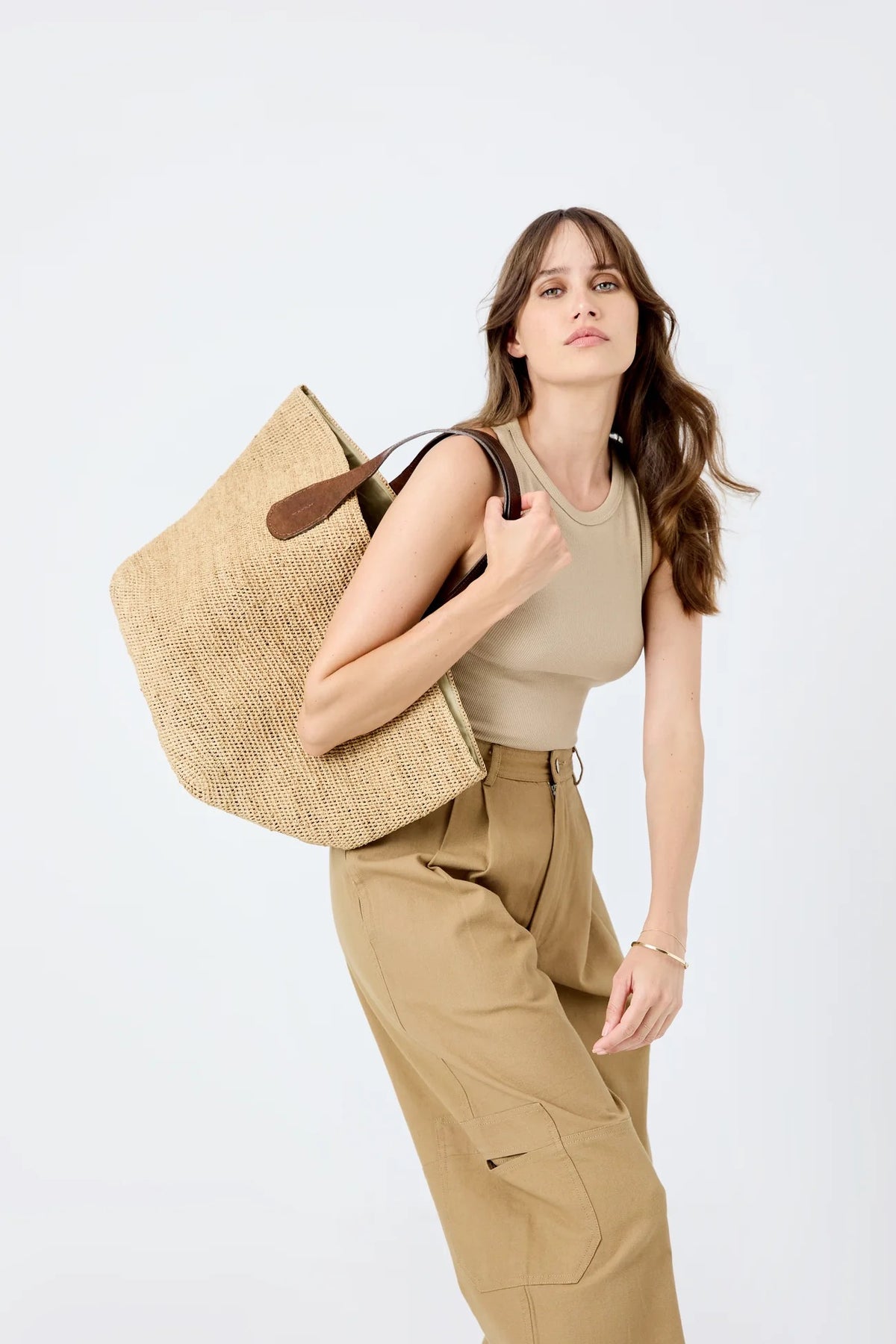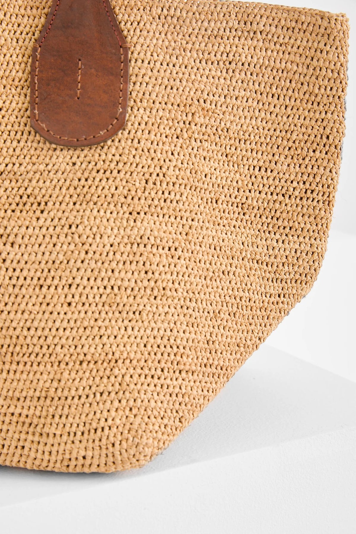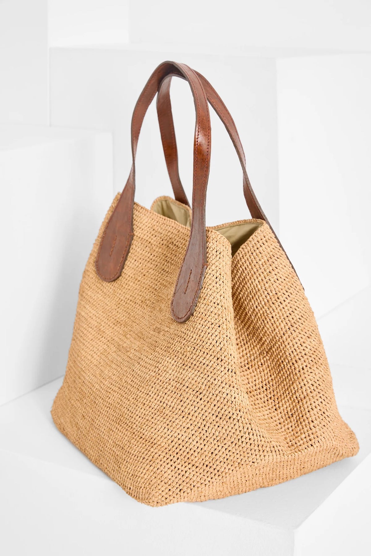 Materialer: 100 % naturlig raffia og fôret med økologisk bomull. De to håndtakene er laget av vegetabilsk garvet zebu-lær.