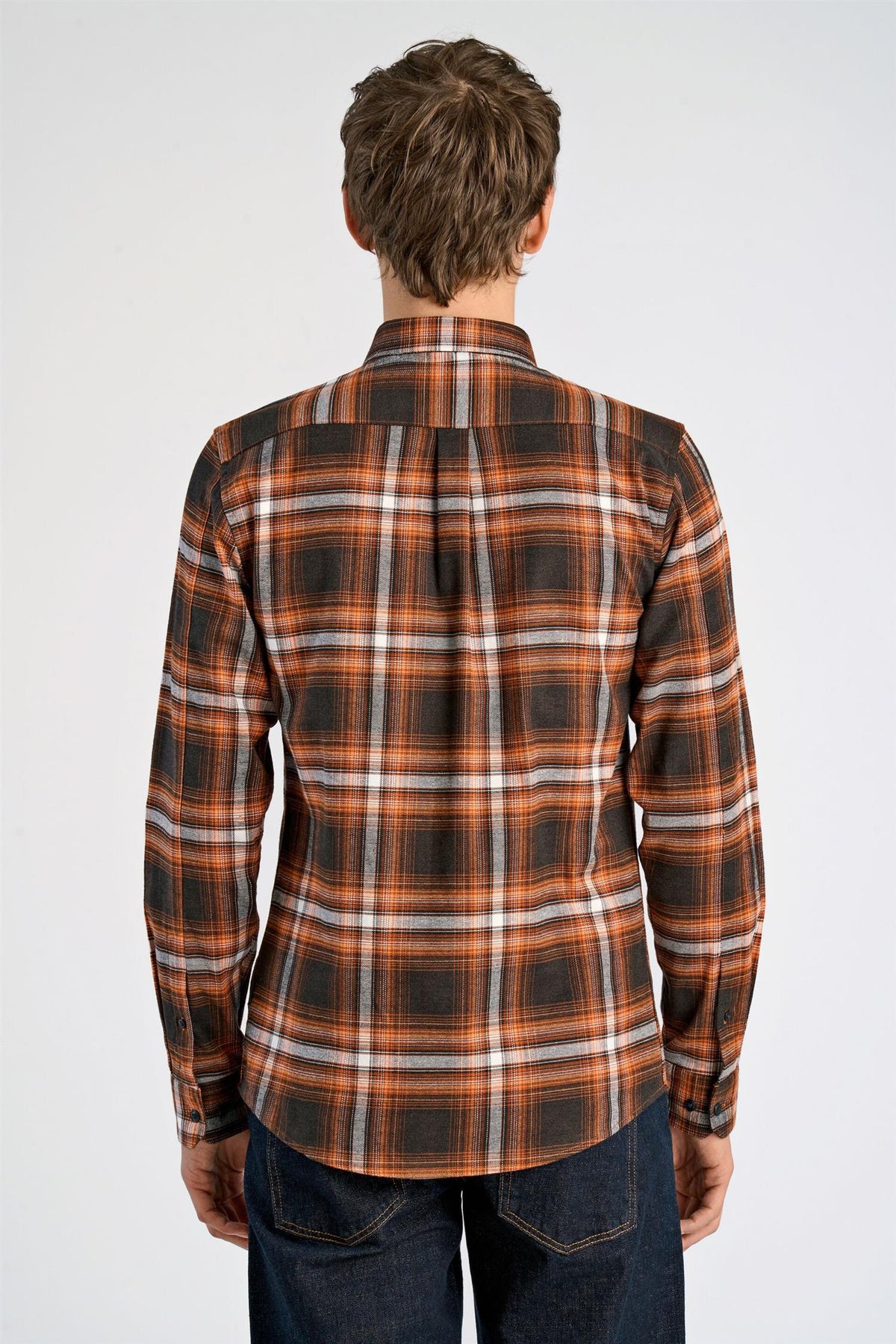 Rutete skjorte laget av en bomullsblanding med button-down-krage. Enkel design med brodert logo på venstre side av brystet og en liten logolapp nederst til venstre. Skjortens passform er avslappet, noe som er litt strammere enn vanlig passform, men som fortsatt gir rom for bevegelse.