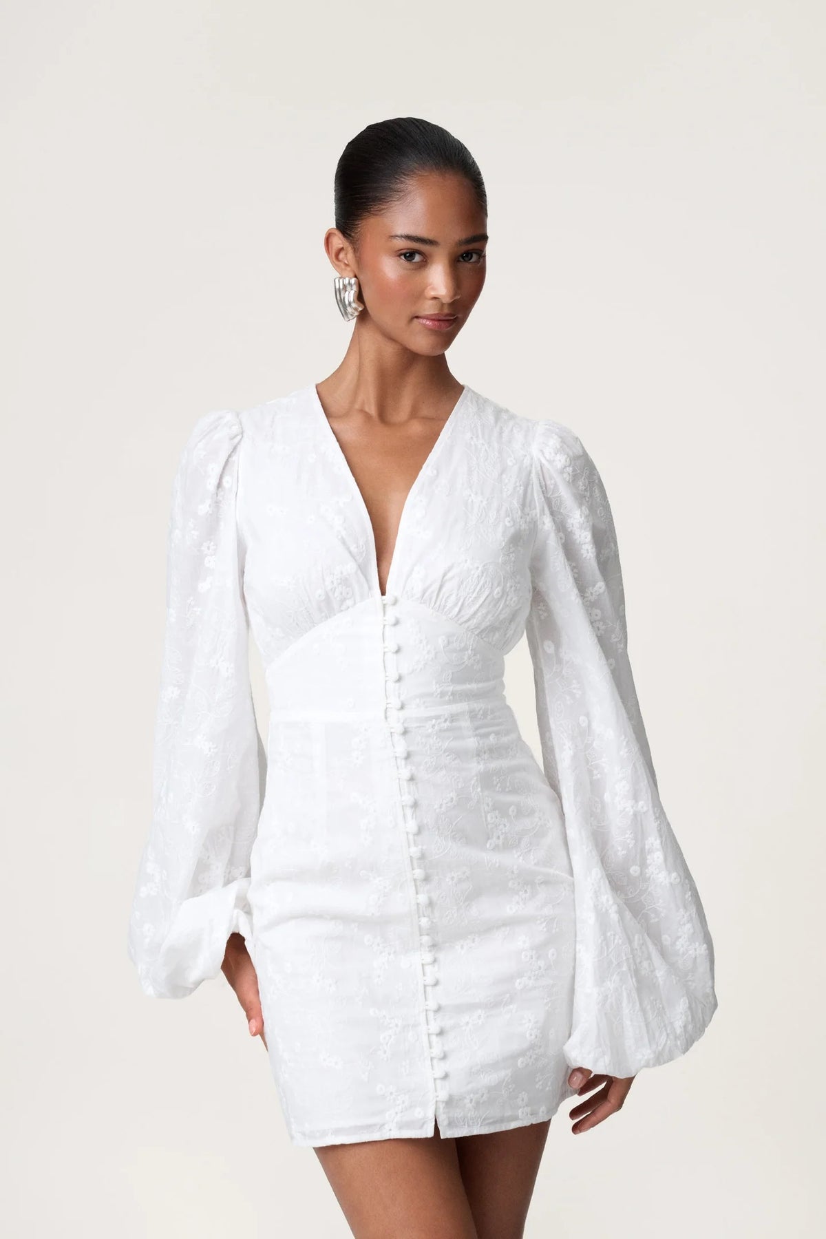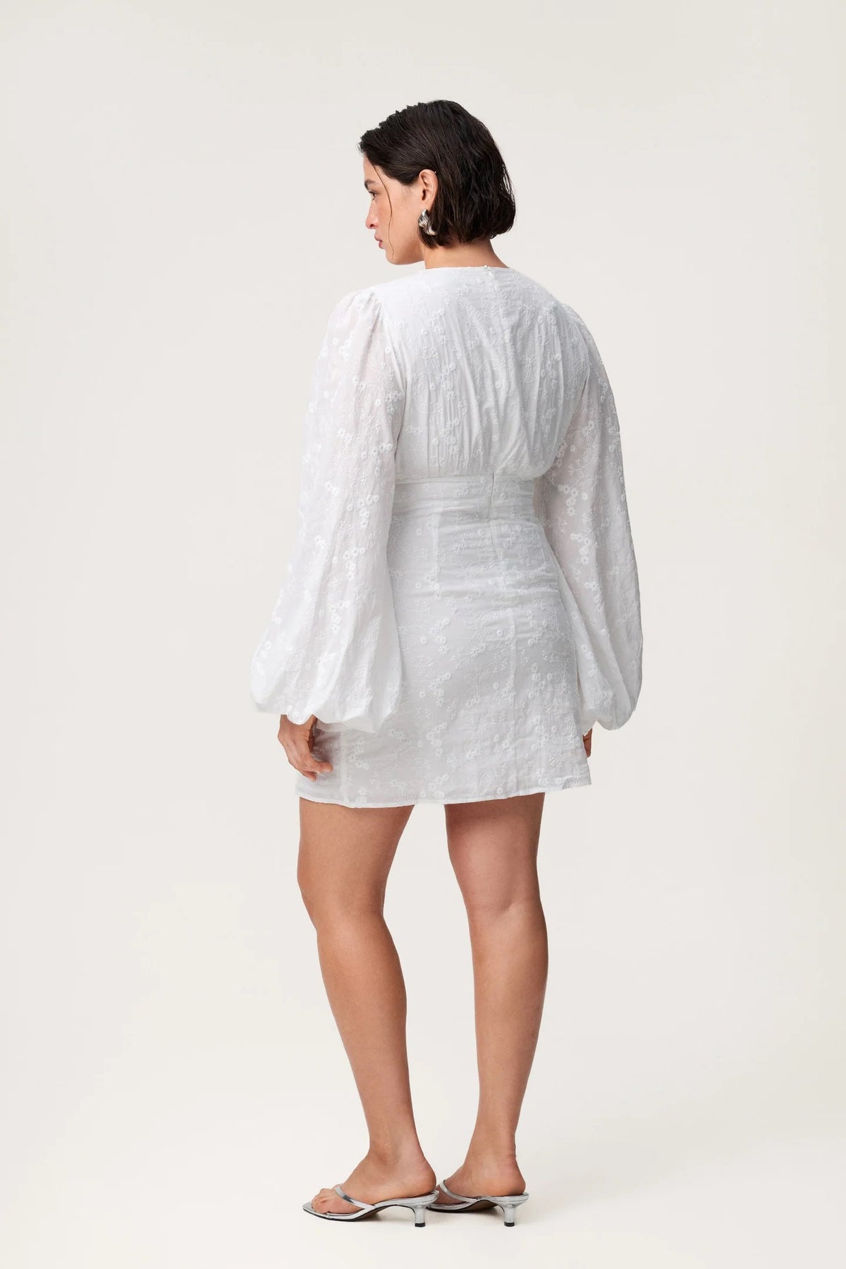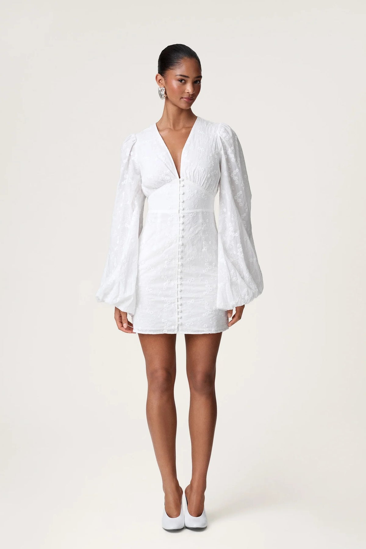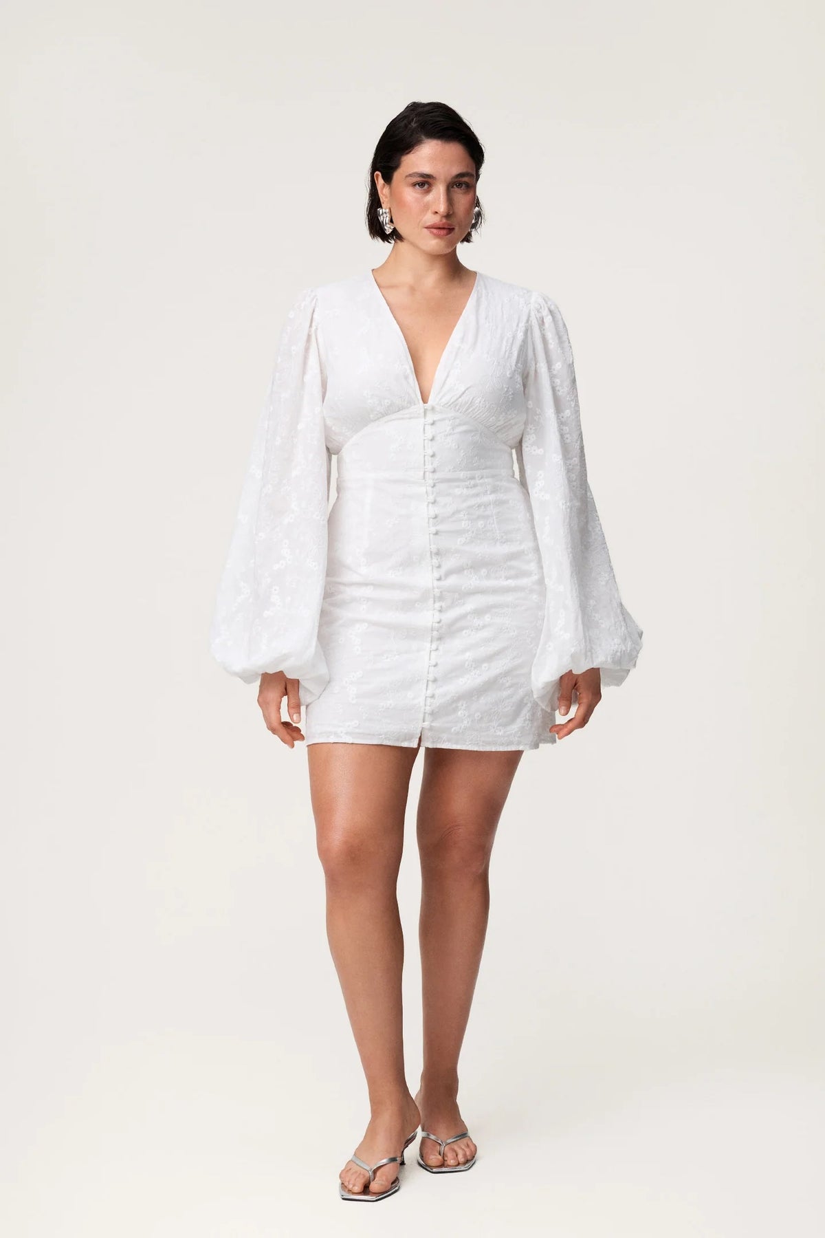 Florence-kjole i hvitt broderi. Kjolen har en V-formet halsutringning, knapper langs fronten og voluminøse ermer. Kjolen er minilang og lukkes med skjult glidelås bak.