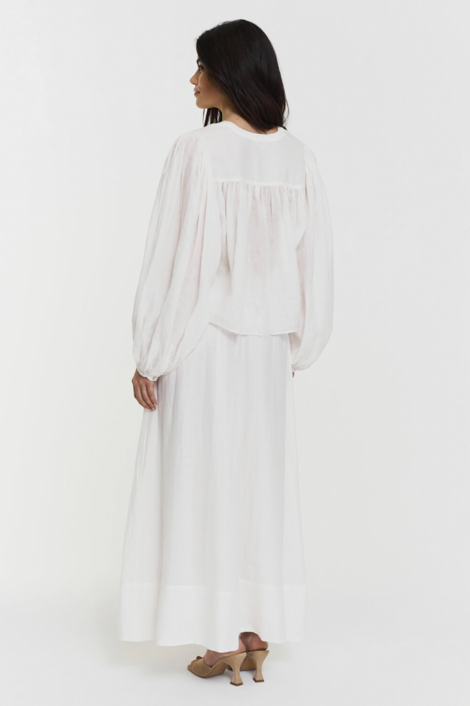 Leja-blusen har en knappelukking foran med rynkede mansjetter og delikate folder bak. En tidløs stil som balanserer myk volum med en raffinert silhuett.