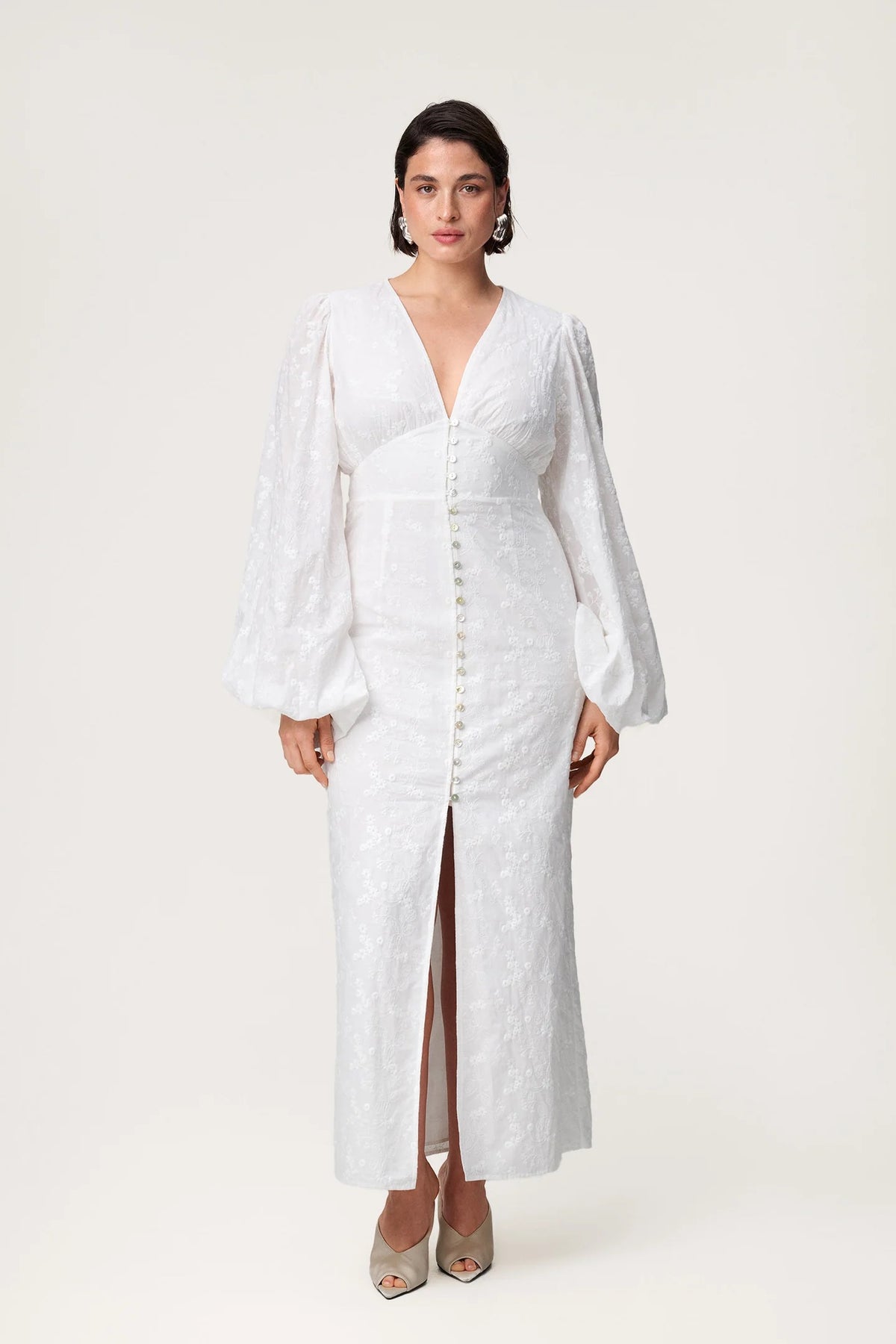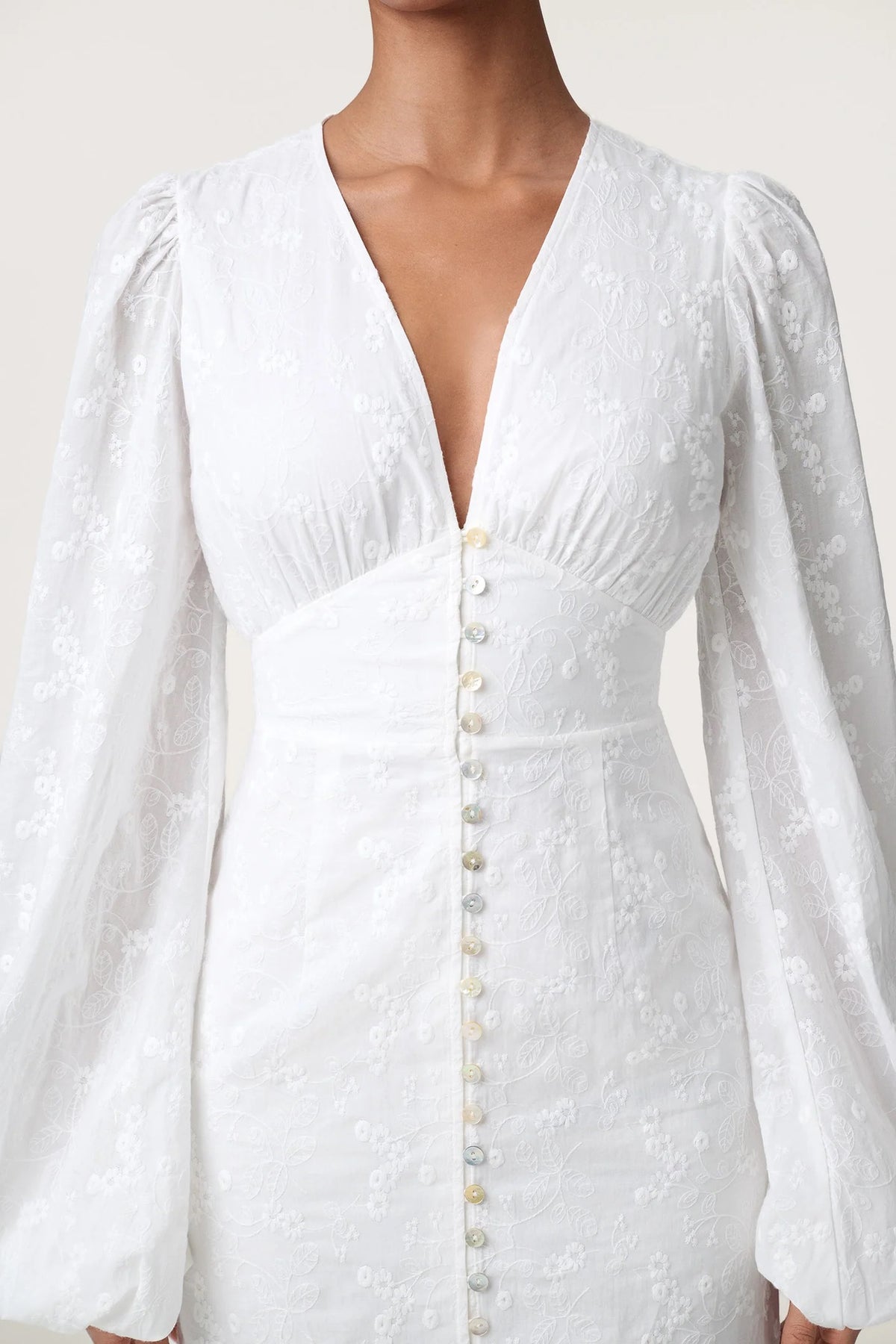 Positano-kjole i hvitt broderi. Kjolen har en V-formet halsutringning, knapper langs fronten og en splitt nederst foran. Den er helfôret, har lange ermer og en skjult glidelås bak. I år har denne Positano-kjolen blitt forbedret ved å legge til fire elastiske knappeløkker nederst for en mer komfortabel og slitesterk passform.