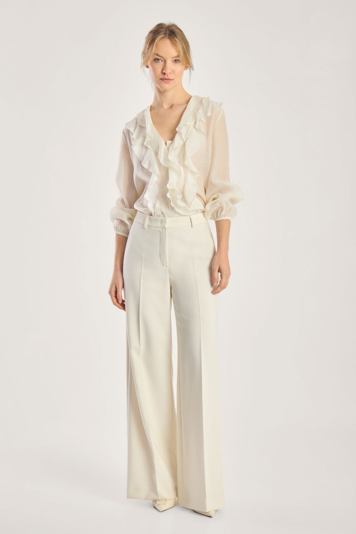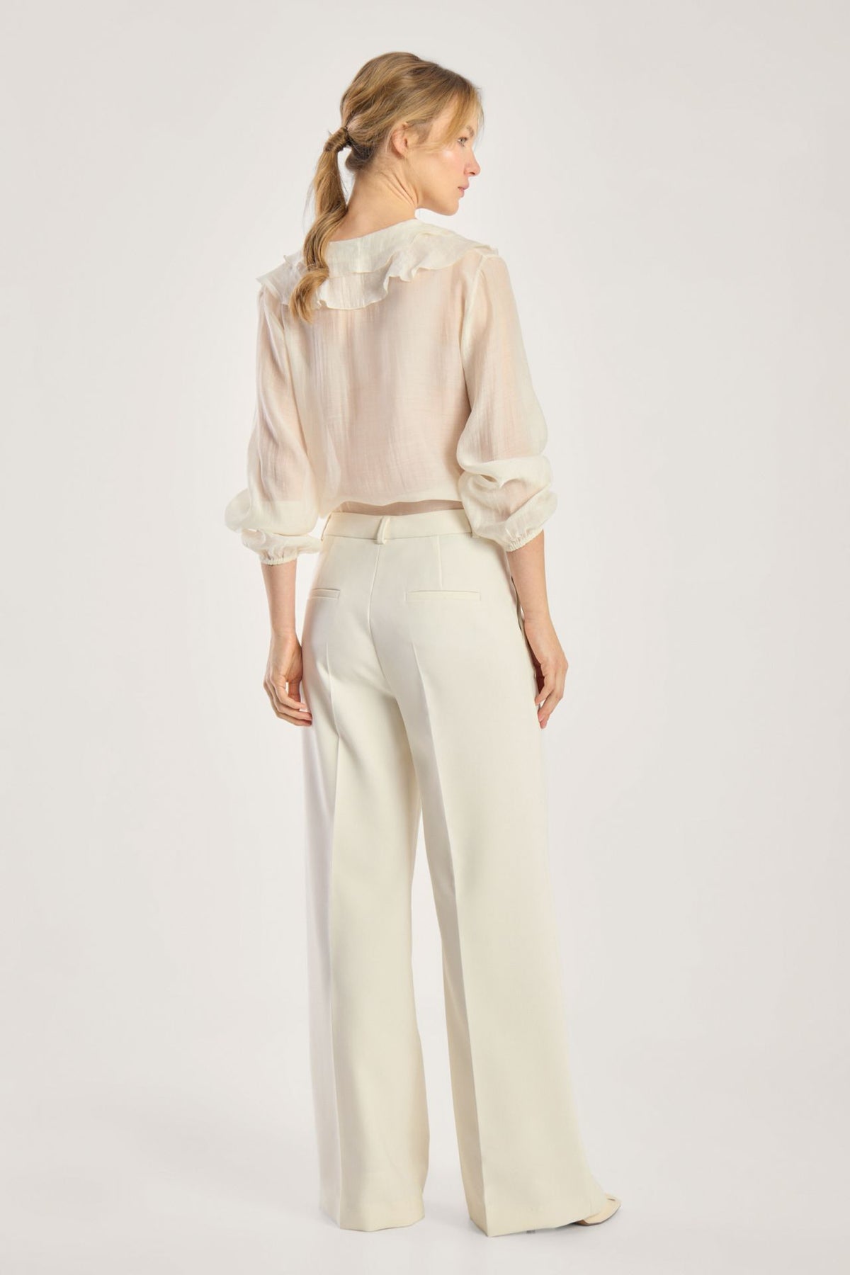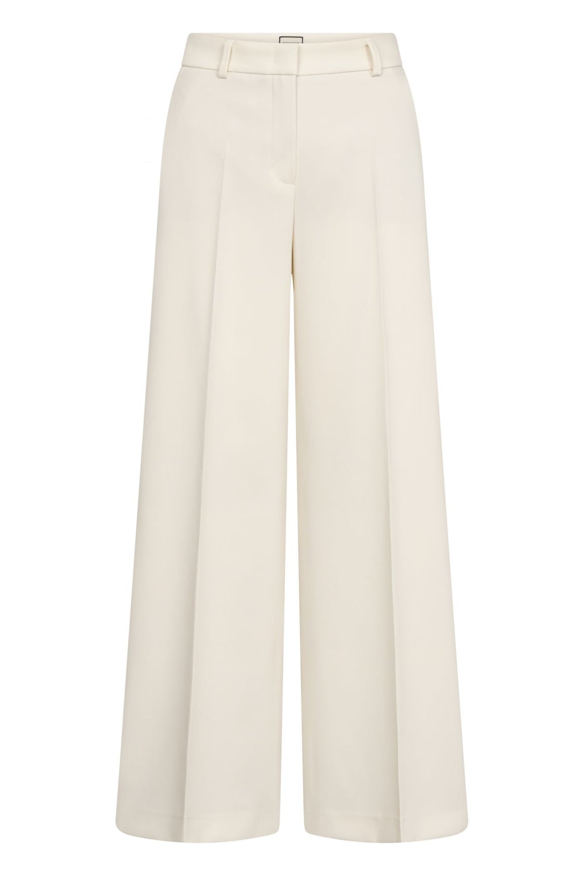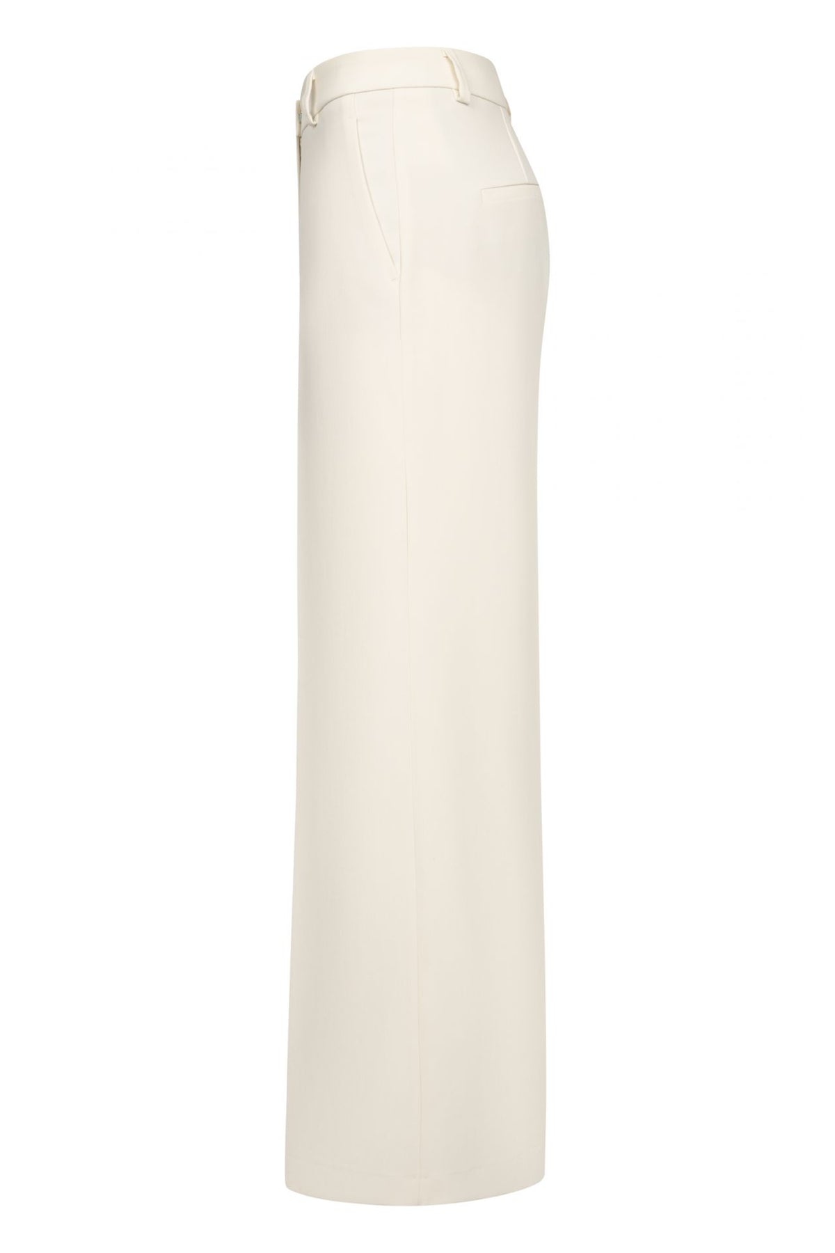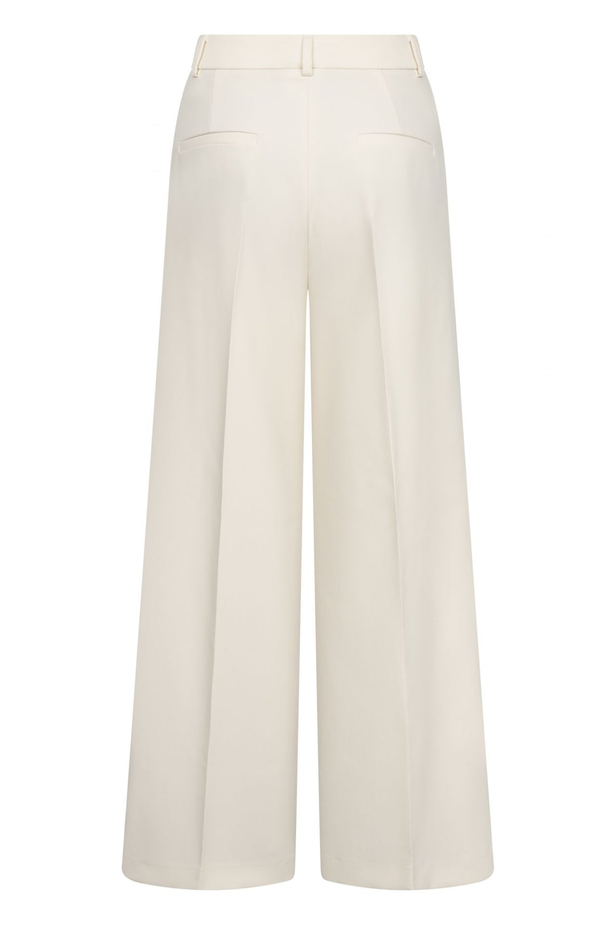 Disse elegante buksene har et vidt ben og høy midje som gir en flatterende og moderne silhuett. De er designet med franske lommer foran og passpolerte baklommer for et stilrent uttrykk. Buksene er laget i et lett og flytende stoff med en lett strukturert overflate som er både formstabil og enkel å vedlikeholde. Den elastiske kvaliteten sørger for god komfort og bevegelsesfrihet gjennom dagen. Buksene har en innerbenlengde på 81 cm og en fald på 68 cm.
