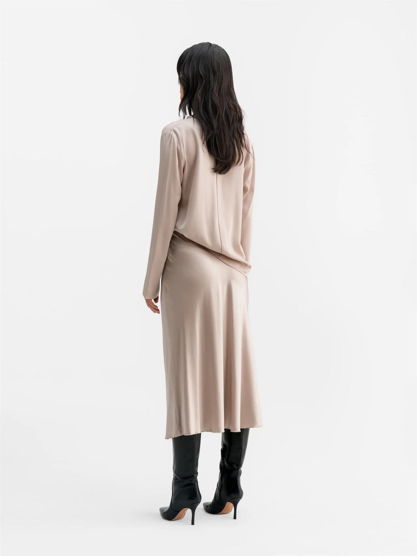 Zia blusen er kuttet av Ahlvar Gallery sin klassiske silke/stretch og har en dyp fossdrapering sammen med deres signaturermer med en dobbelt-lags mansjett, splitt og metallisk knapp. Ryggraden er dekorert med en broderisøm.