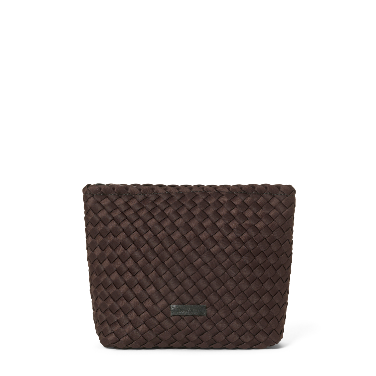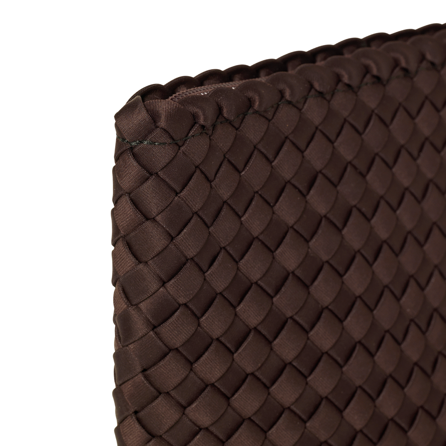 Denne vesken er håndvevd i et mykt dobbeltsidig neoprenmateriale og har en dekorativ kant som gir et elegant uttrykk. Den lukkes med en innfelt glidelås og har en innvendig glidelåslomme. Perfekt for småting eller som en liten sminkepung i vesken.