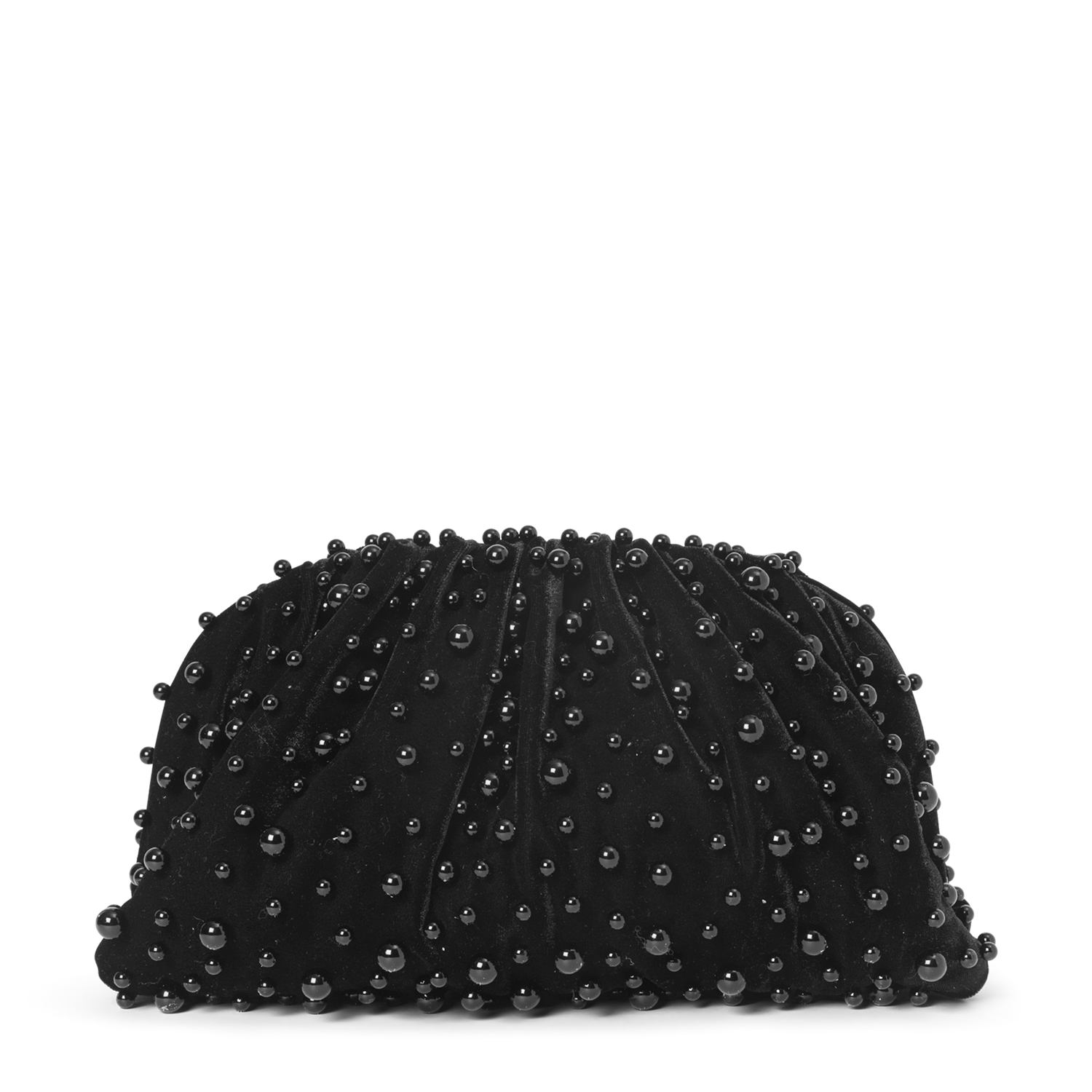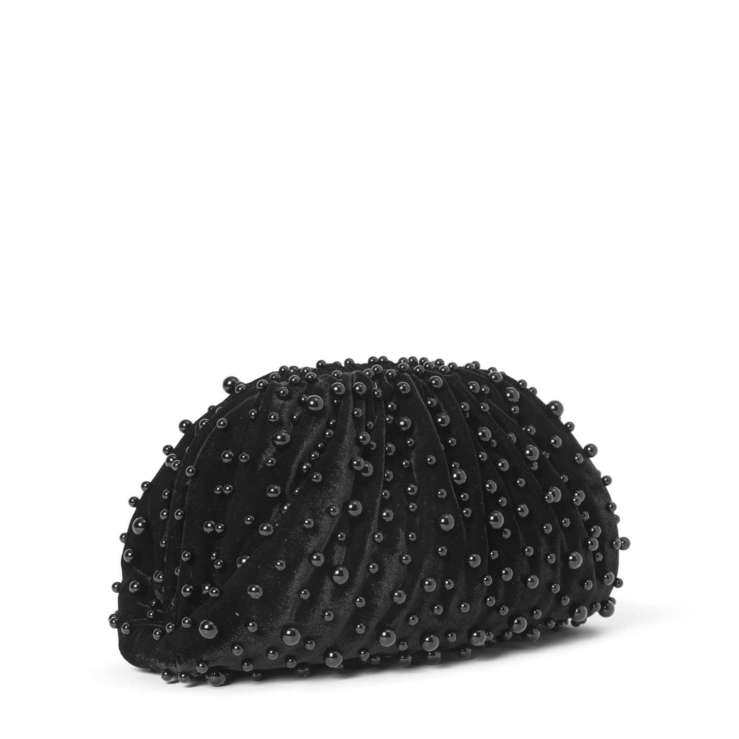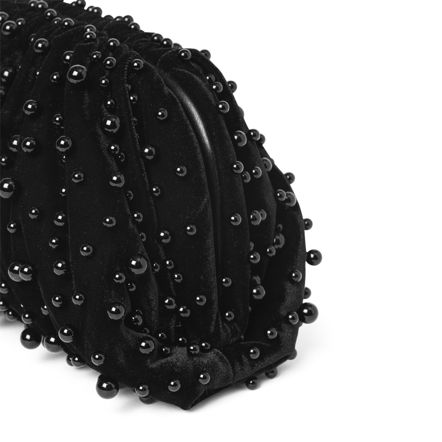 Denne clutchen er laget av svart velour og dekorert med svarte perler for en elegant finish. Den har en formbevarende bunn og en klassisk lukking i imitert skinn. Innvendig er det et lett twillfôr og en liten innerlomme med glidelås for det viktigste.