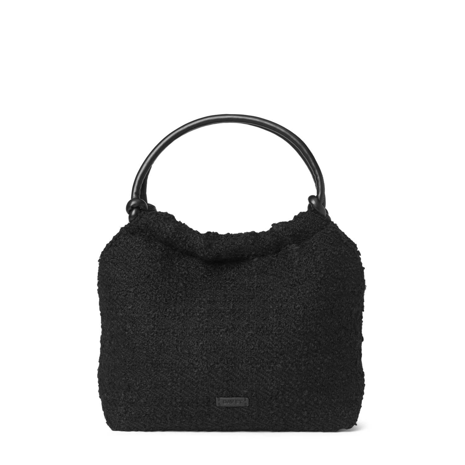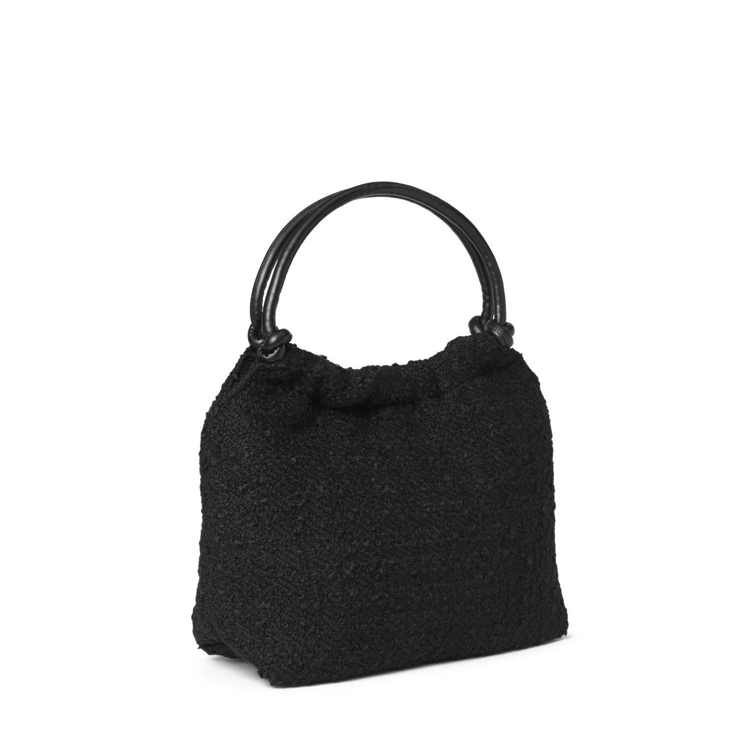 Denne vesken kombinerer struktur og mykhet med sitt svarte bouclé-materiale i ullblanding og de karakteristiske rørhåndtakene i imitert skinn med knutedetaljer. Den lukkes med en skjult magnet og har en praktisk innerlomme med glidelås. Veskens form og størrelse gjør den til en enkel følgesvenn i en travel hverdag.