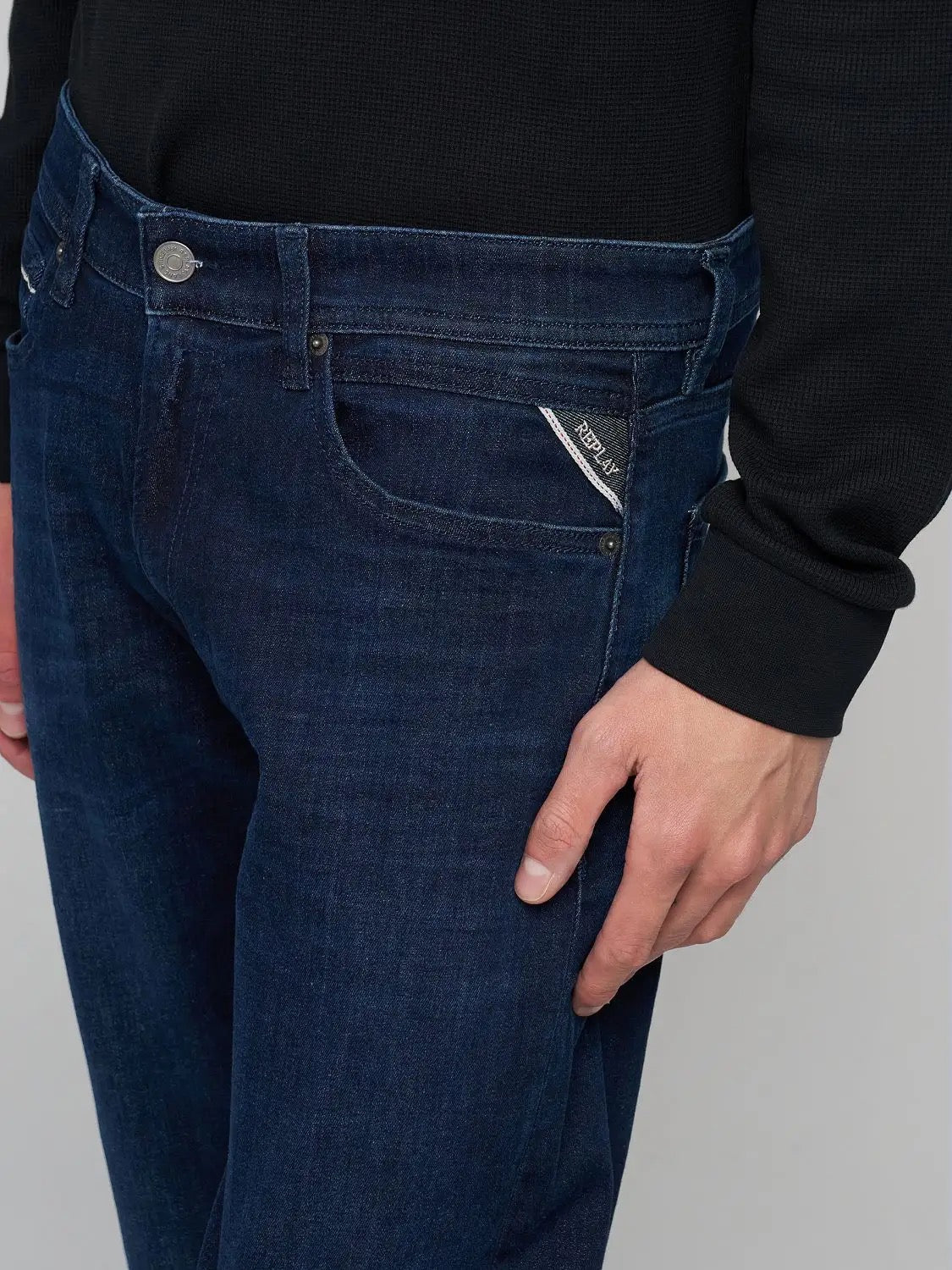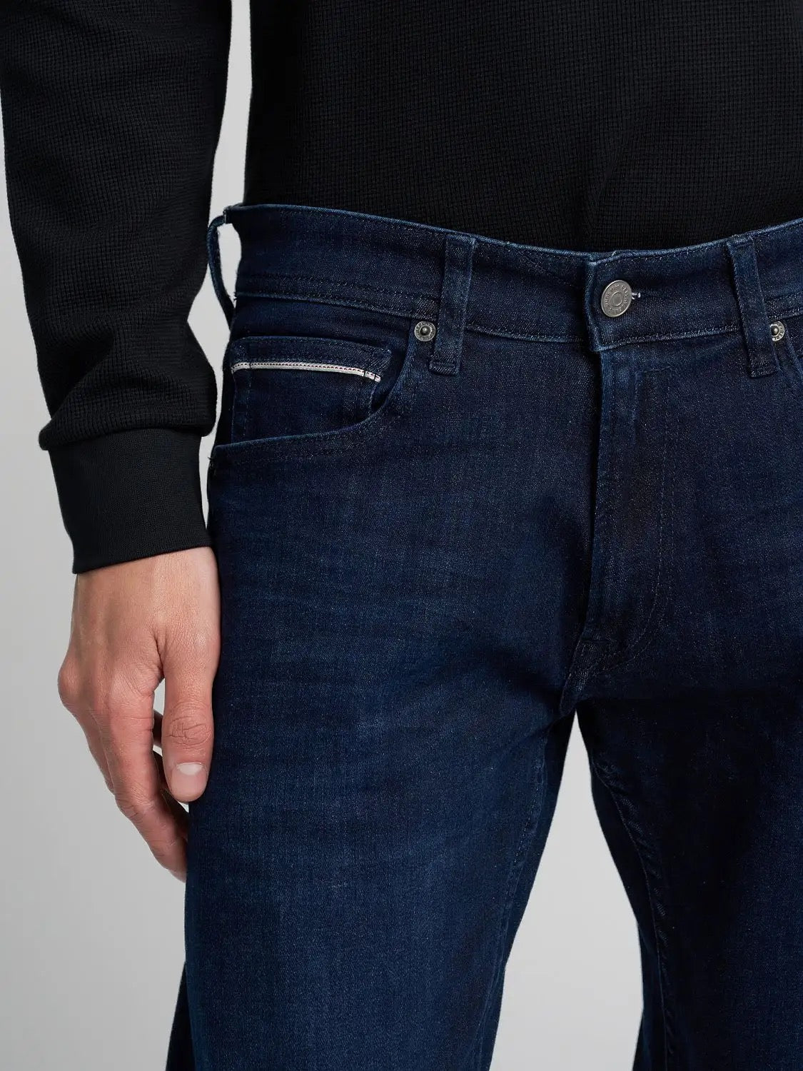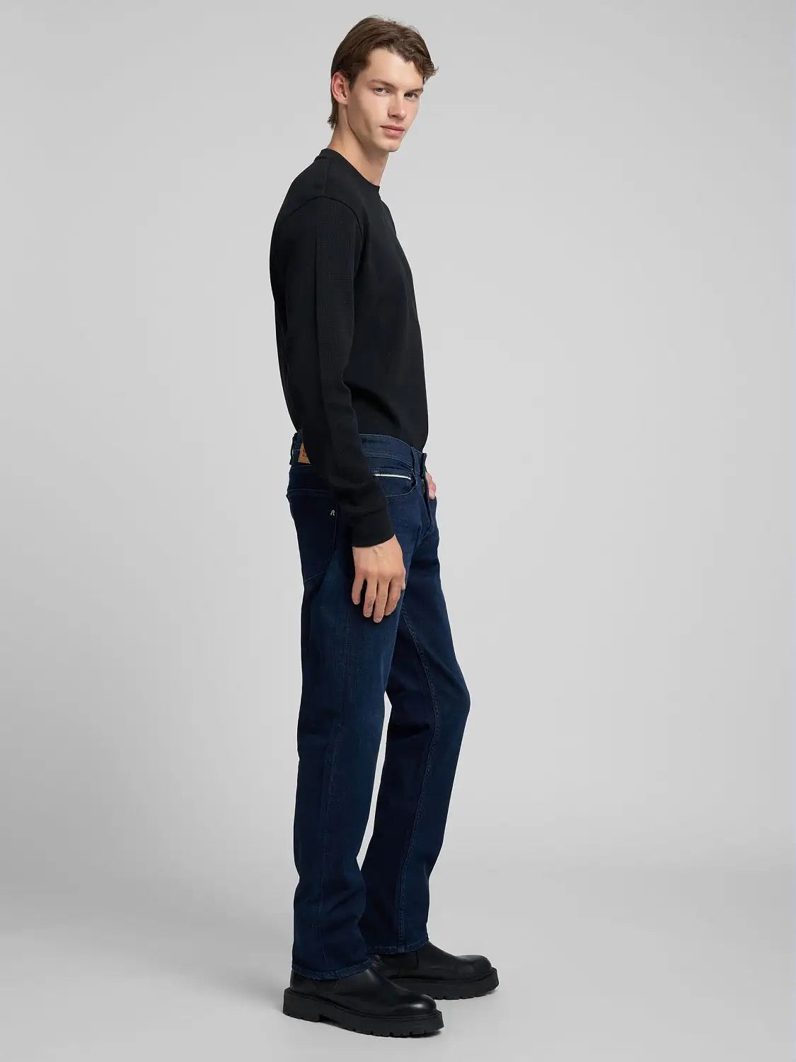 Rett passform med normal midje og rette ben fra hofte til fald for en komfortabel passform. Dette femlommersplagget kommer i 280 g bomullsblanding i mørk indigo power stretch-denim med mørk enzymvask og har håndlagde skrapemønstre som skaper kontrast på de brukte områdene. Vår ikoniske måkevingesøm dekorerer baklommene, hvorav en også er brodert med bokstaven R. Knapp- og glidelåslukking.