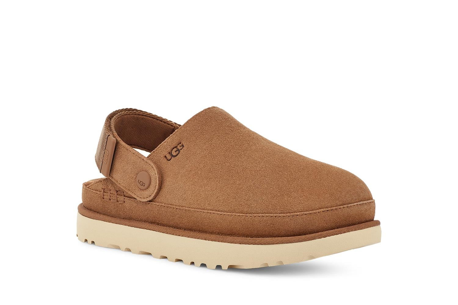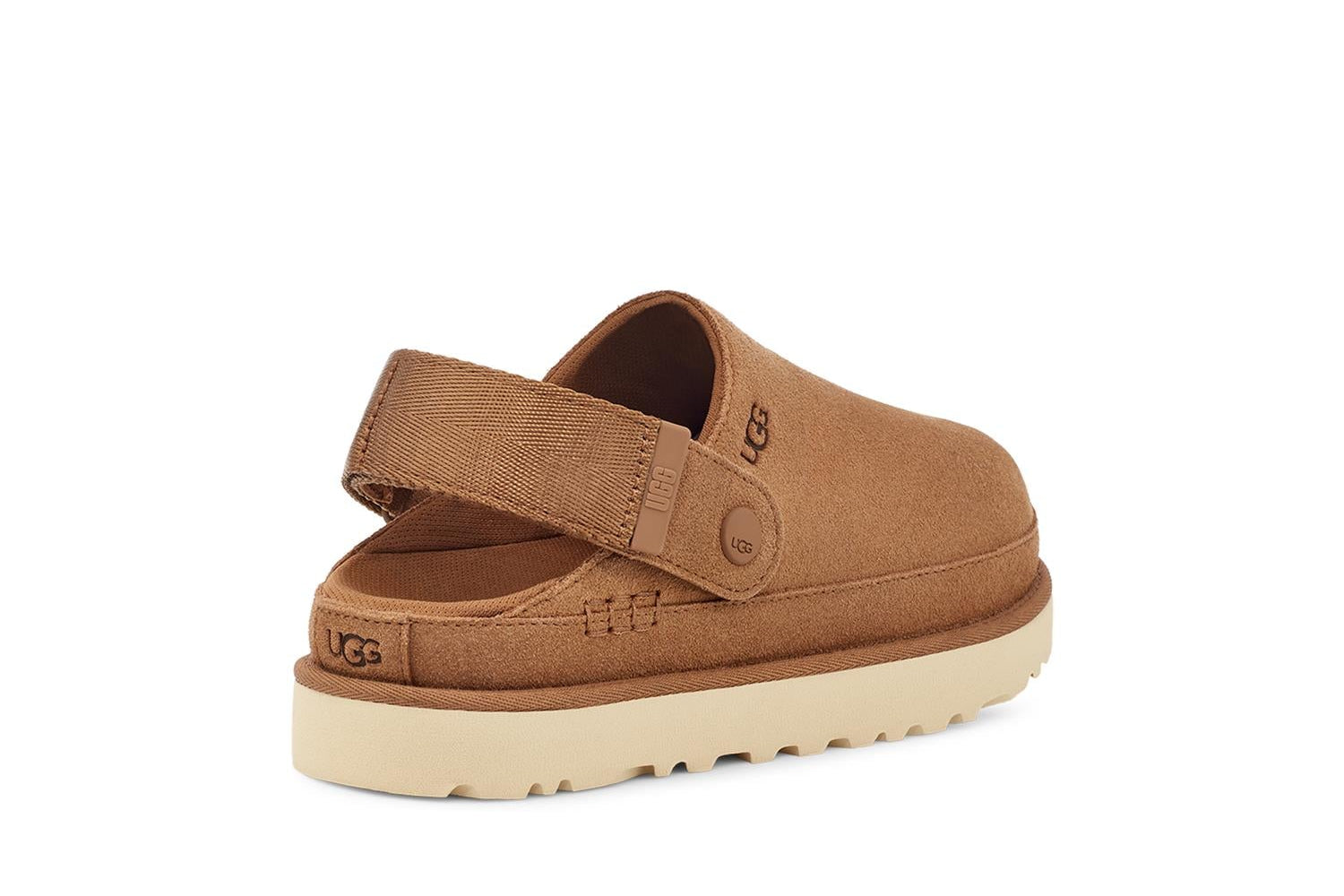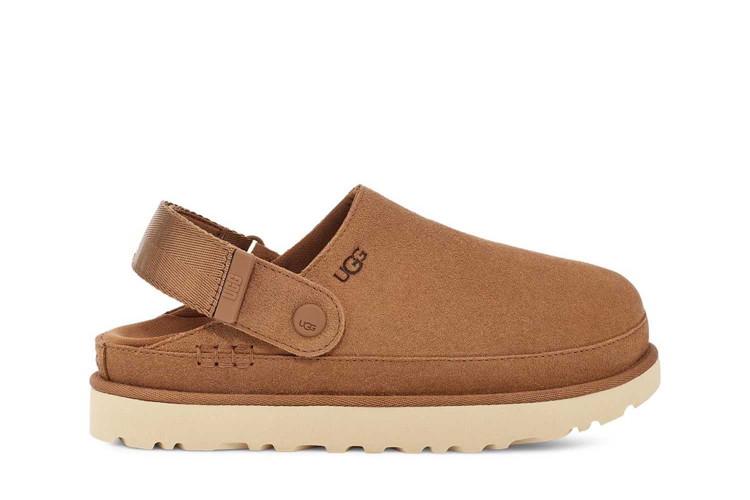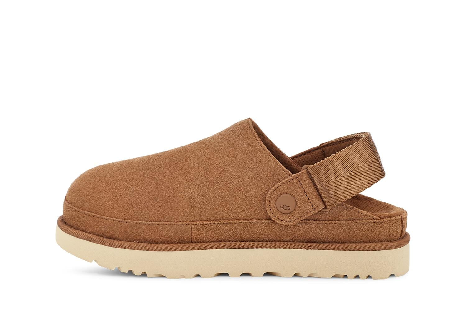 W Goldenstarg Clog kombinerer UGGs ikoniske stil med komfort og bærekraftige materialer. Overdelen i semsket skinn gir et luksuriøst uttrykk, mens den justerbare hælstroppen med borrelås sikrer perfekt passform og enkel bruk. TPU-detaljer med grafisk UGG-logo og webbing bak på hælen gir et moderne og sporty preg. Clogen har tekstilfôr laget av 100 % resirkulert polyester og en konturert EVA-fotseng som gir behagelig støtte gjennom hele dagen. Mellomsåle og yttersåle i Sugarcane™ EVA, fremstilt med resirkulert EVA-materiale, sikrer demping, fleksibilitet og bærekraft. Små detaljer som resirkulert polyesterkant og preget UGG-logo fullfører det gjennomførte designet.