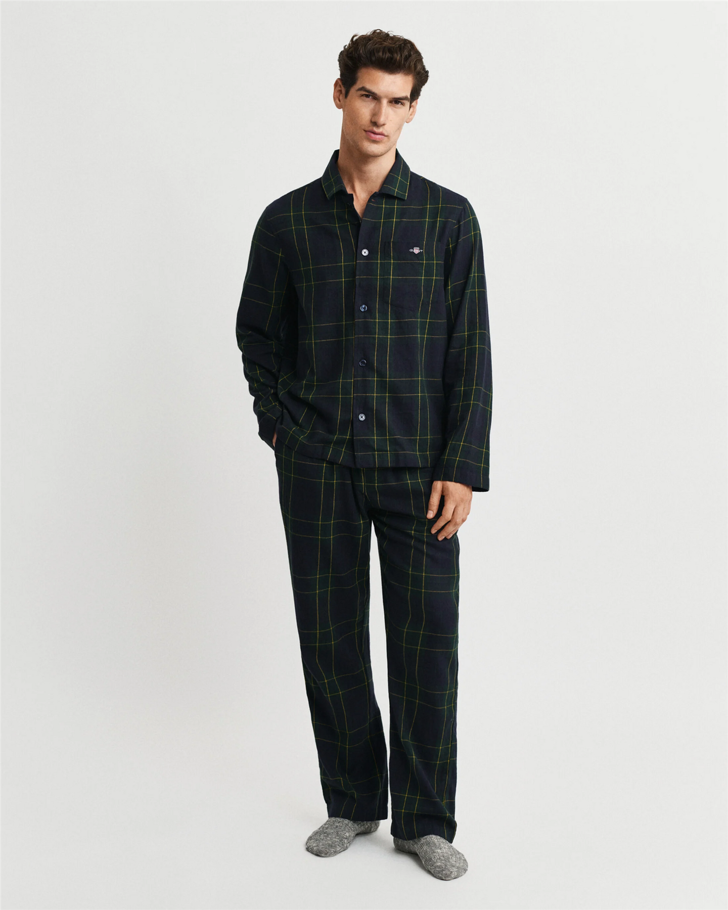 Dette pysjamassettet kommer i en førsteklasses gaveeske og består av én skjorte og ett par bukser laget av 100 % bomull med flanellruter. Skjorten er designet for en normal passform, har knapper foran, lange ermer og et GANT-skjold-grafikk brodert på brystlommen. Buksene har sidesømmerlommer og snøring i midjen.